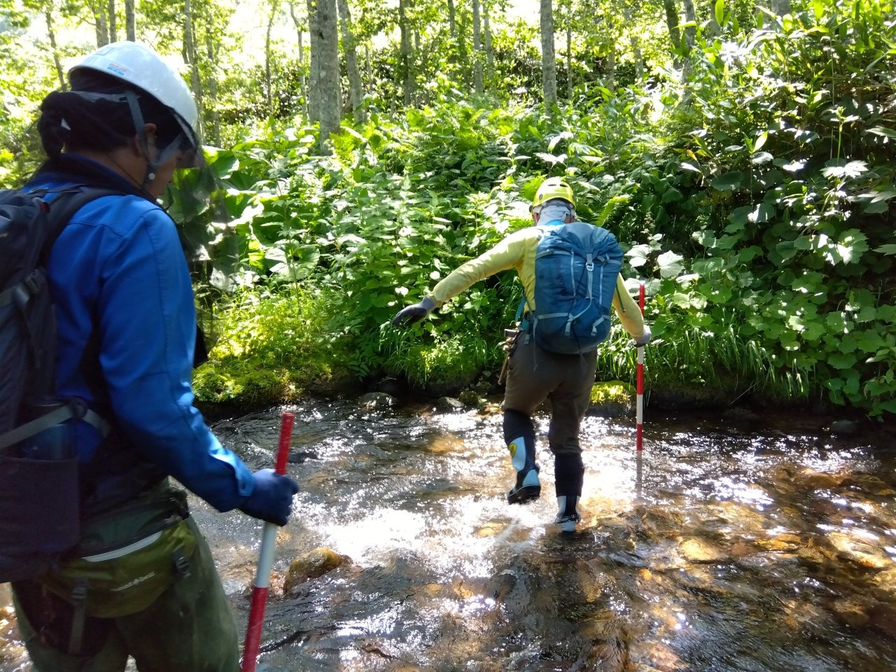 調査道具を背負いながら、ササ地や沢などの道のない場所を歩いたり、急斜面を登ったりもします。場所によっては2時間以上歩くこともあり、たどり着くまでが結構大変に感じることもしばしば。