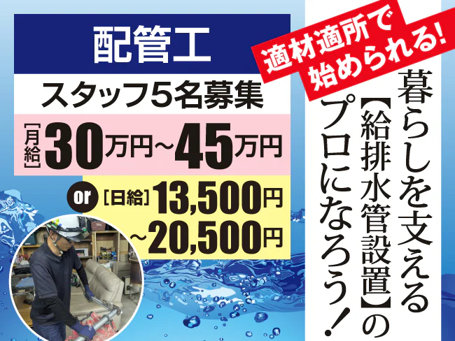 - 工場・大型商業施設・マンション・病院などの給排水・冷暖房設備の工事。経験・スキルに合わせて、適材適所で働いていただきます。
