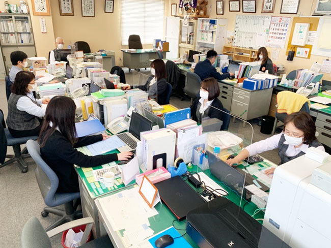<事務所内の様子>配属先となる総務部は現在男性2名・女性6名が活躍中です。賑やかで気の良い優しい社員ばかりですので、すぐに職場にも慣れていただけると思います。
