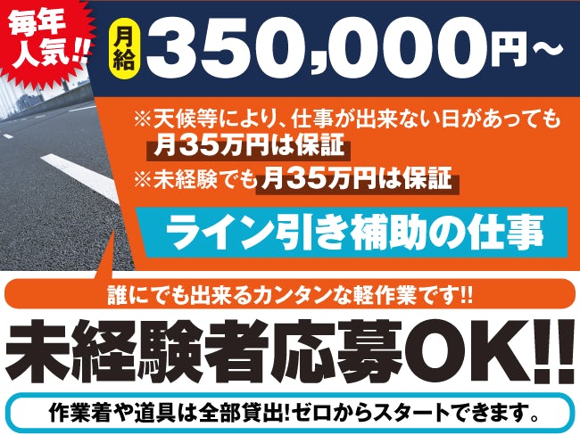 - 道路の白線引き補助の作業です。ライン引きのためのテープ貼りや掃除等の簡単な作業ですので、未経験の方も大丈夫です。作業はイチから親切・丁寧に指導しますので安心です。
