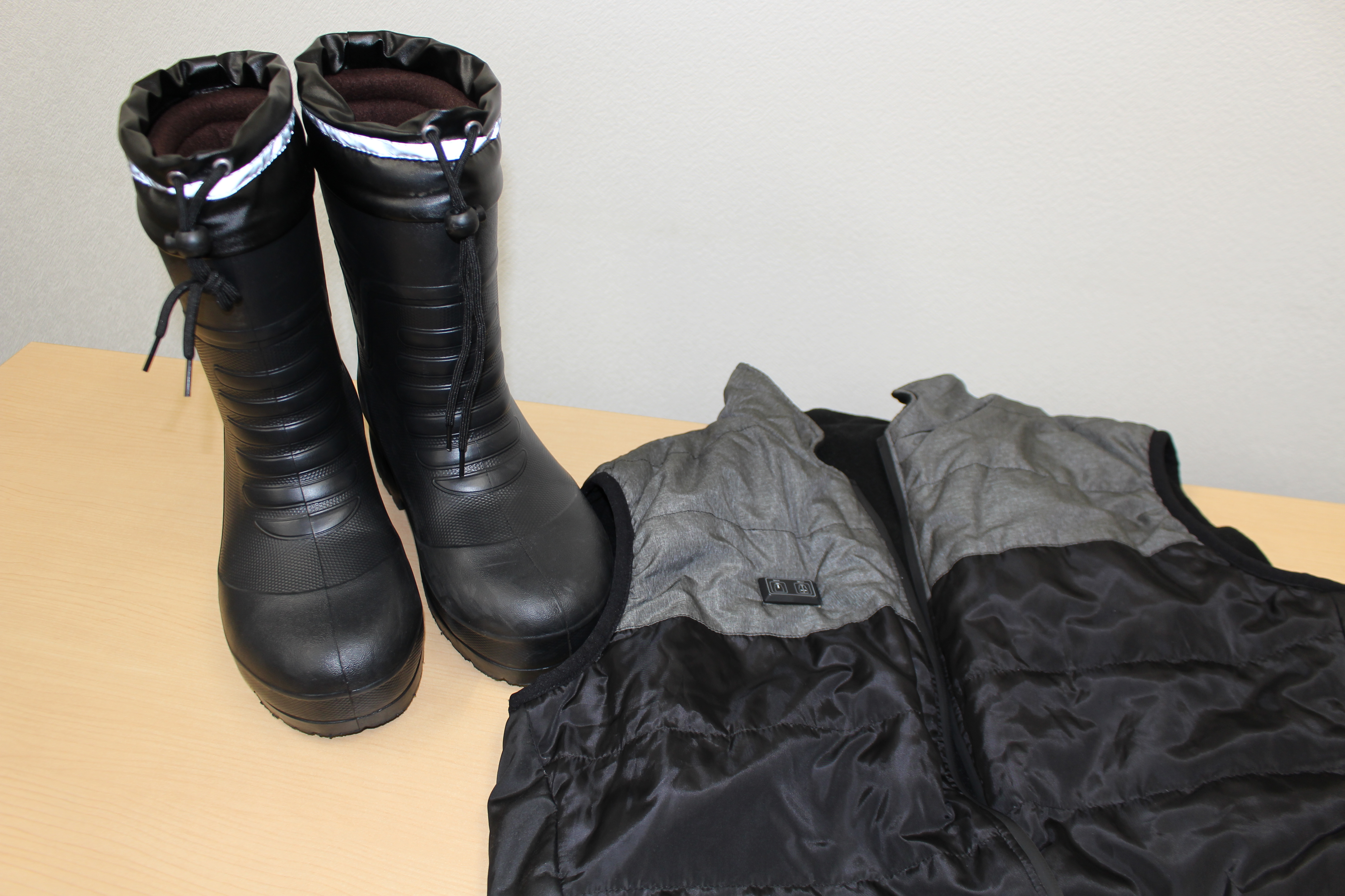 冬:バッテリー使用で温かくなるヒーターベスト、防寒長靴、手袋