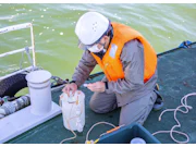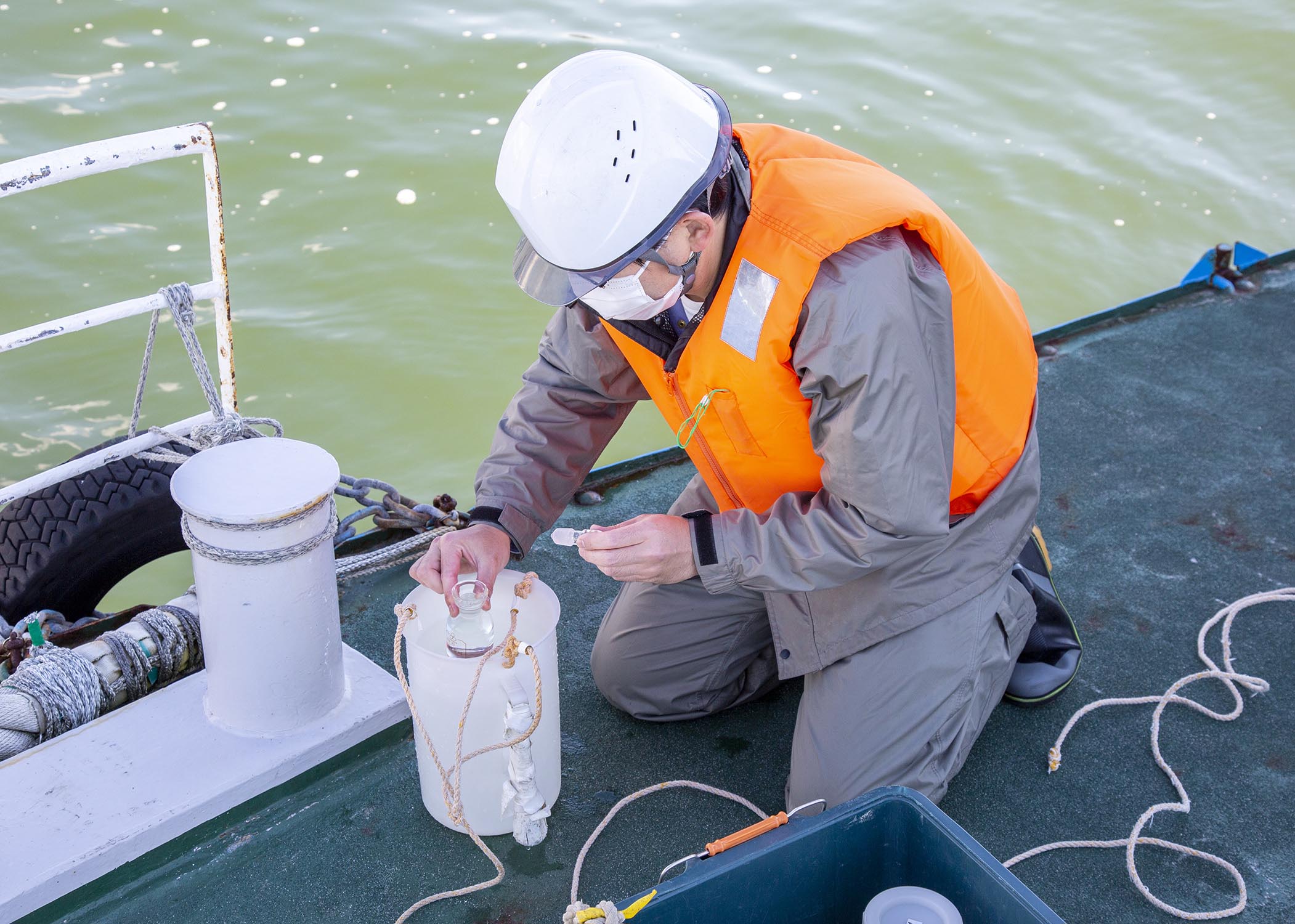 調査エリア内の海や川で調査対象物をサンプリングします。サンプリングした対象物を分析し、規定の数値であることを確認します。