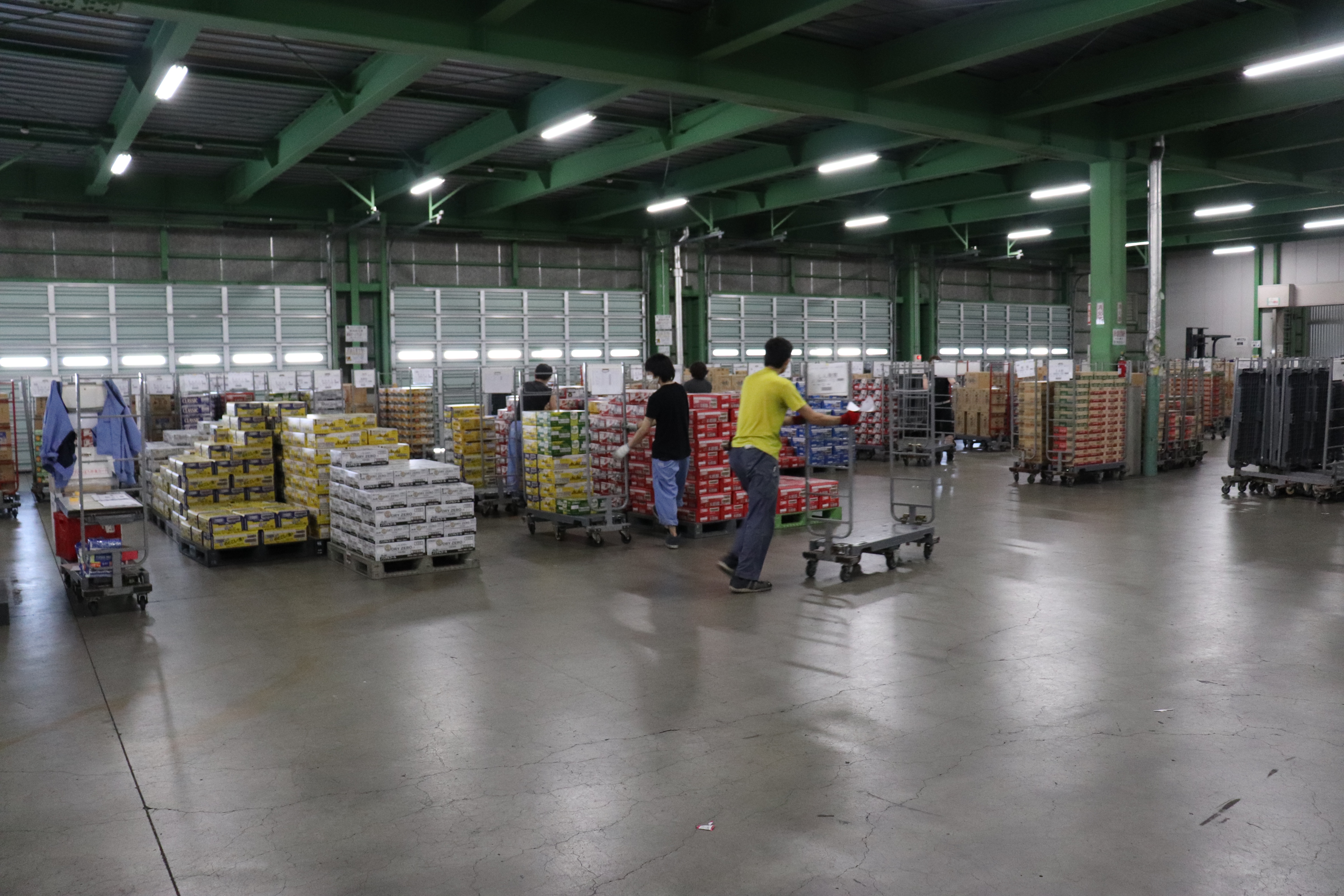 かなり広い倉庫にたくさんの台車や飲料品が並んでいます。まずは職場の雰囲気を感じていただく為に、見学にいらしてみませんか?お見せできる範囲でしっかりとご説明できたらと思っています。