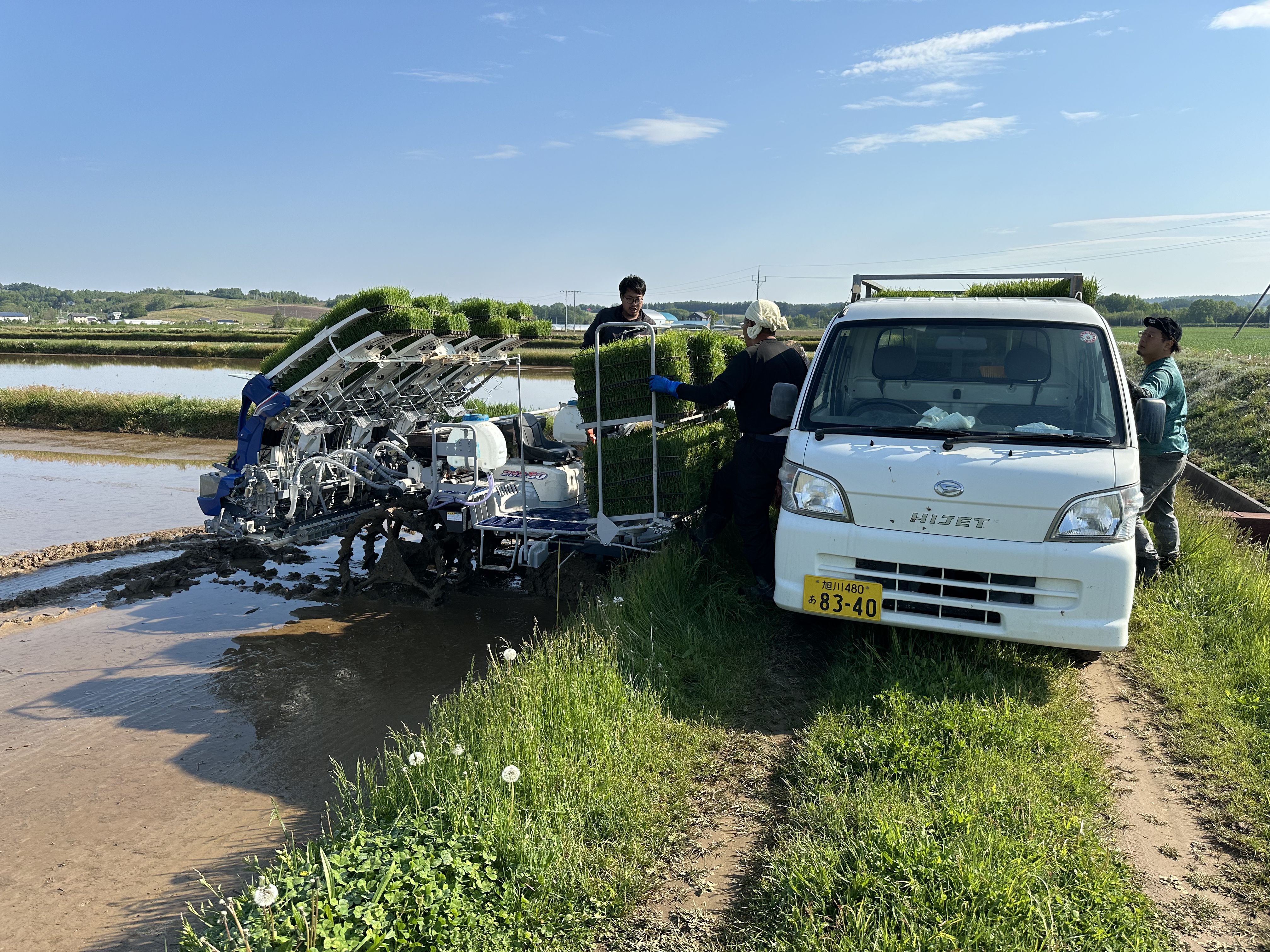 - 玉ねぎ(水稲)の苗をハウスから畑(田んぼ)まで運ぶ