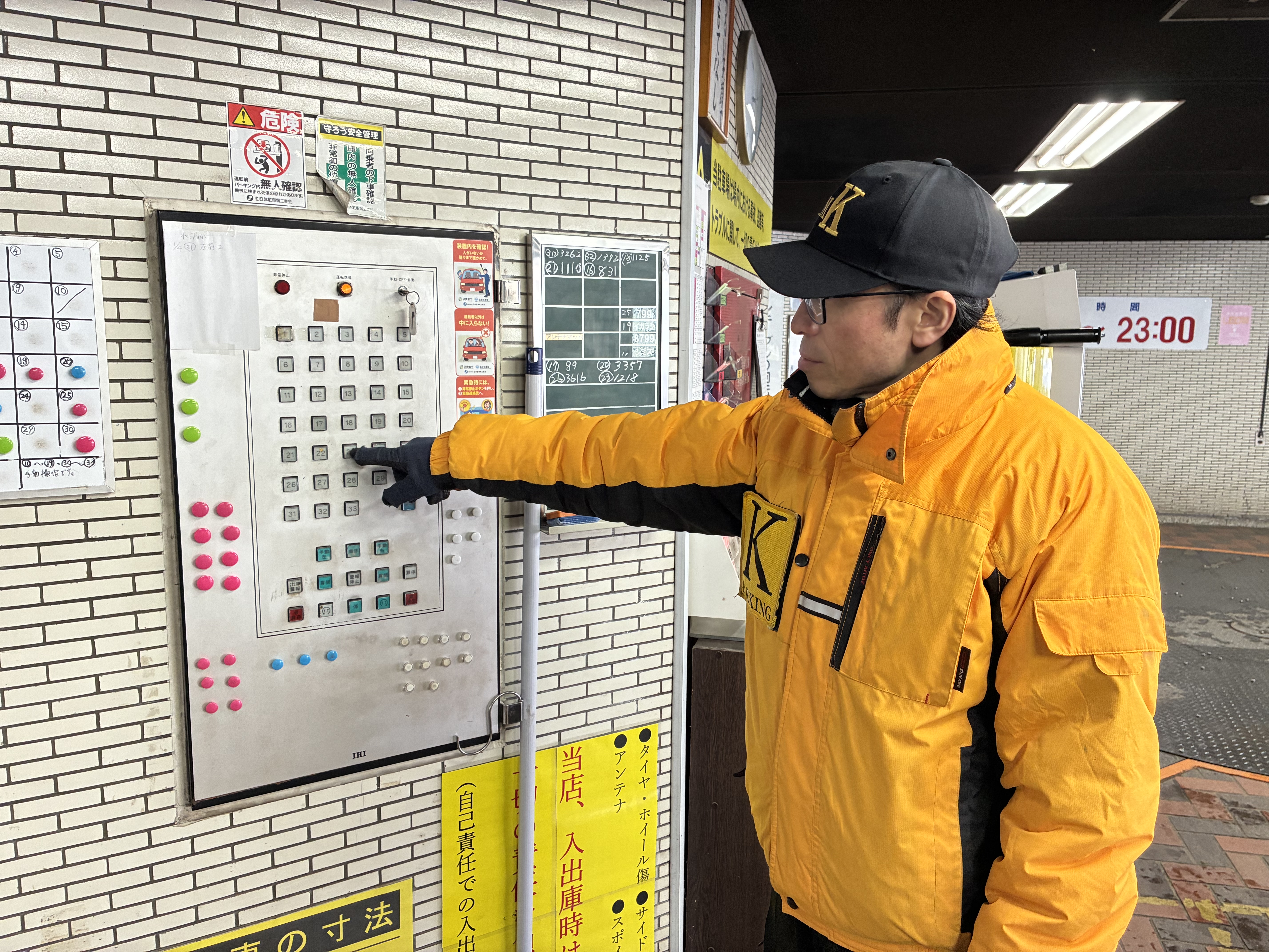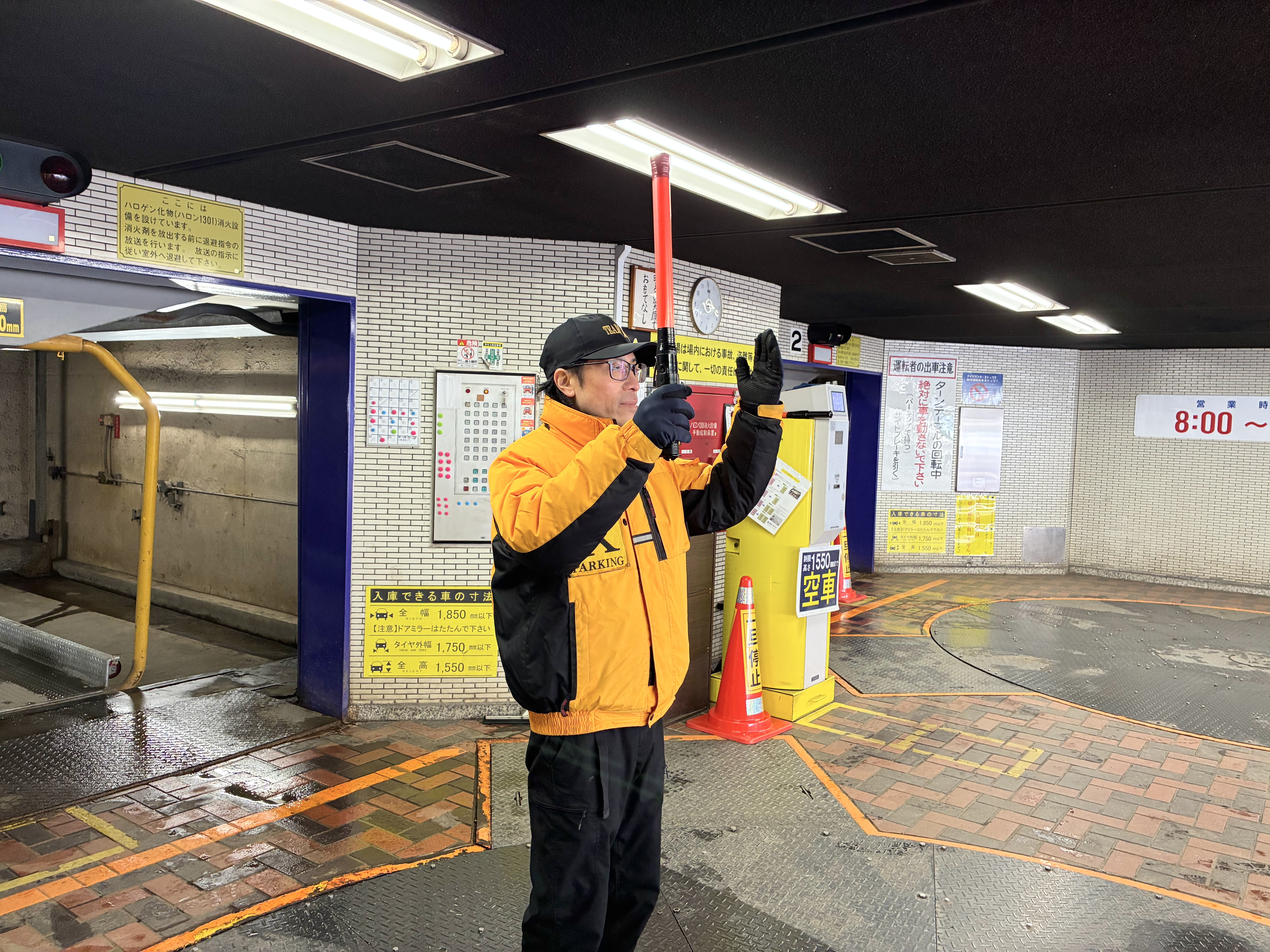 - 入出庫時の誘導、出庫の番号を押す作業、歩行者安全確認、駐車場に車が入るかの確認などをお願いします。
