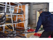<自社倉庫内で"板バネ"を運んでいるシーン>基本的にメーカーから部品を受け取り、車屋や整備工場などへ配達していますが、自社在庫がある場合には、会社から直接配達を行っています。