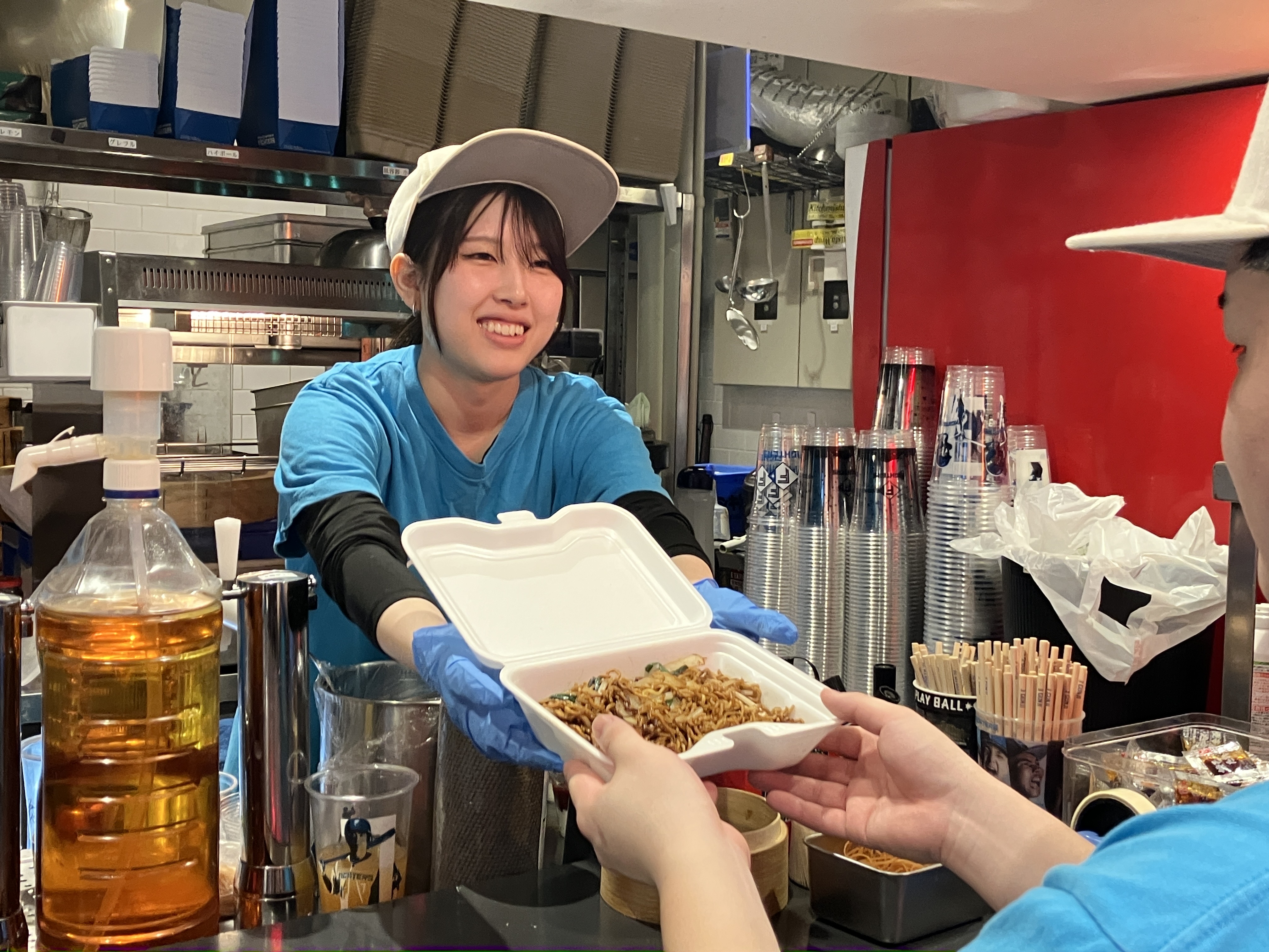 フードコートのような場所にあるので、飲食スペースは店外にあります。基本は販売と接客業務が中心です。試合日やイベント時の勤務ですので、毎日が「お祭り」みたいな感覚で働けます♪