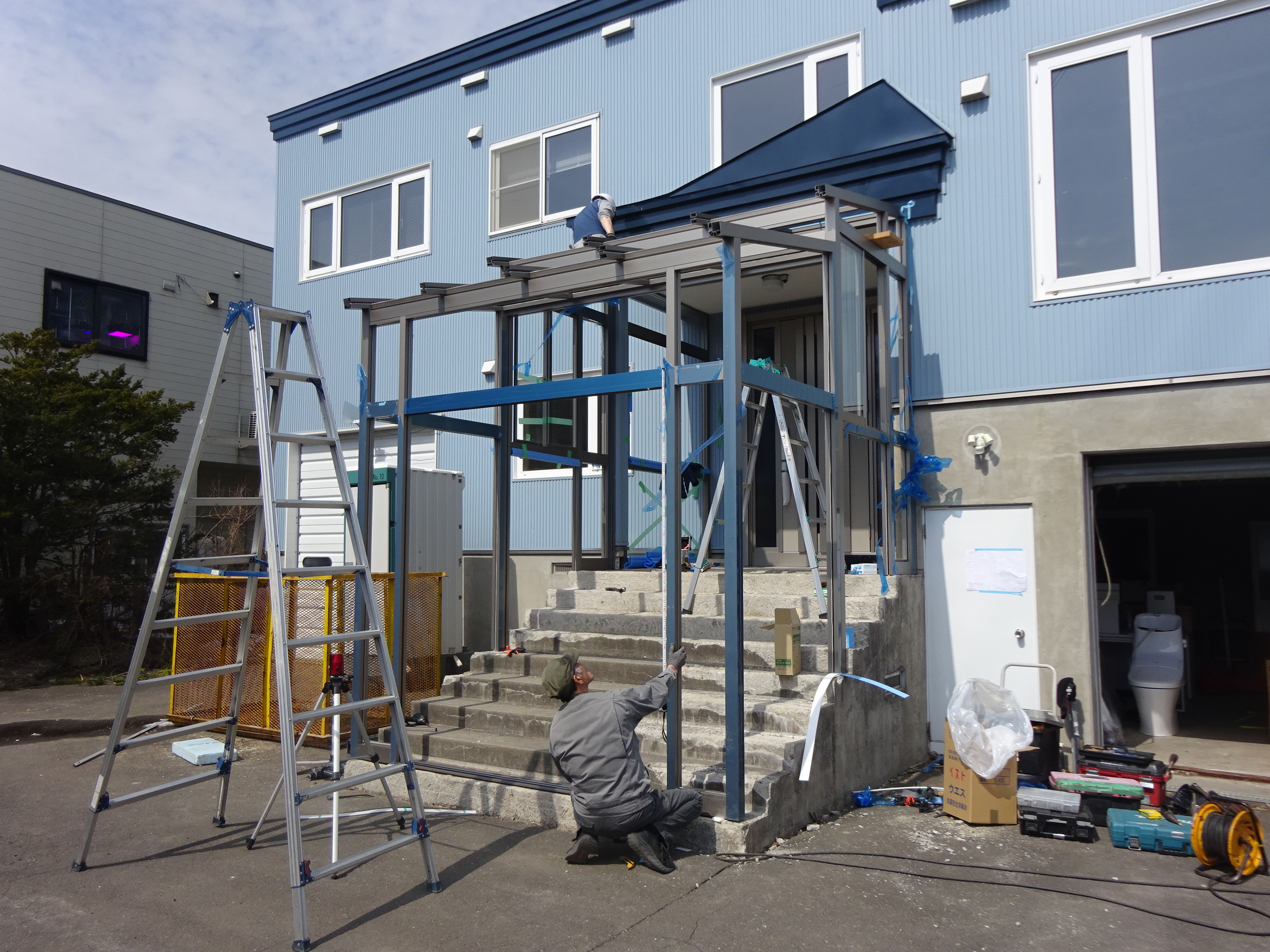 写真は風除室取付工事の現場です。