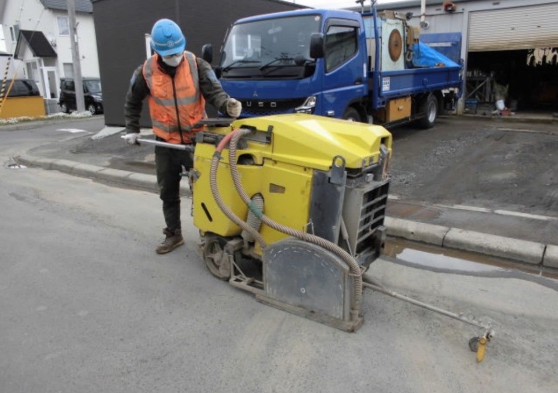 - 専門工具による舗装・コンクリート版の切断作業。