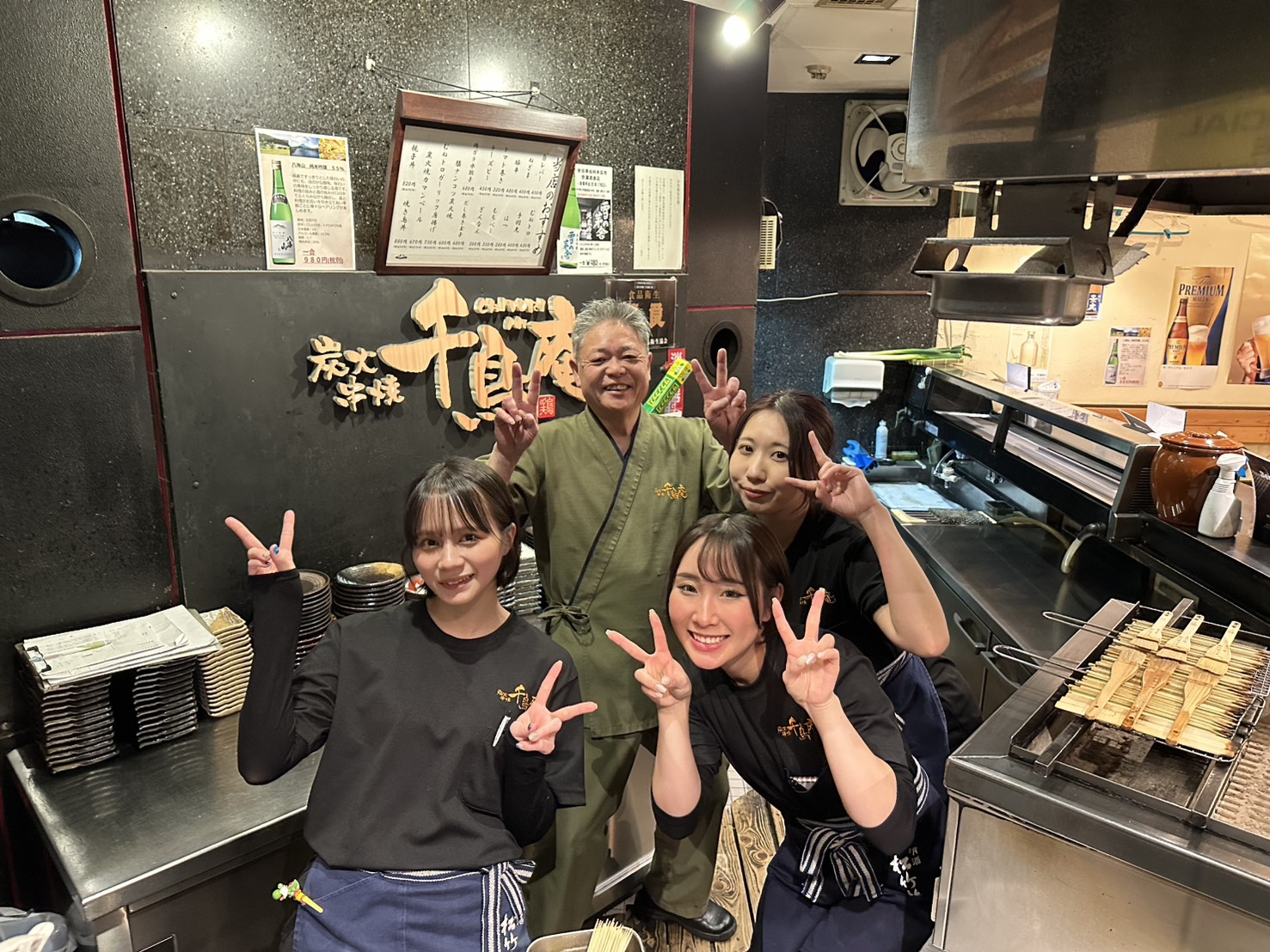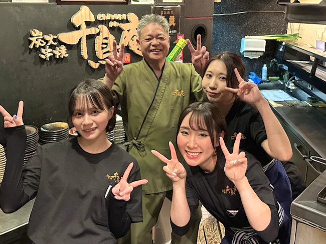 少しでも職場の雰囲気が伝わればと思い、若手スタッフにお願いして一緒に写真を撮りました。写真に写っている彼女たちの他にも、当店には20代のスタッフが3名在籍しており、いつも笑顔が絶えない賑やかなお店です。年齢や経験を問わず、スタッフ同士の仲が良く、チームワークを大切にしながら楽しく働ける環境が自慢です。美味しい焼き鳥と心温まる接客で、お客様に素敵な夜をお届けするやりがいのあるお仕事です。私たちと一緒に、千鳥庵をさらに盛り上げてくれる方をお待ちしております!