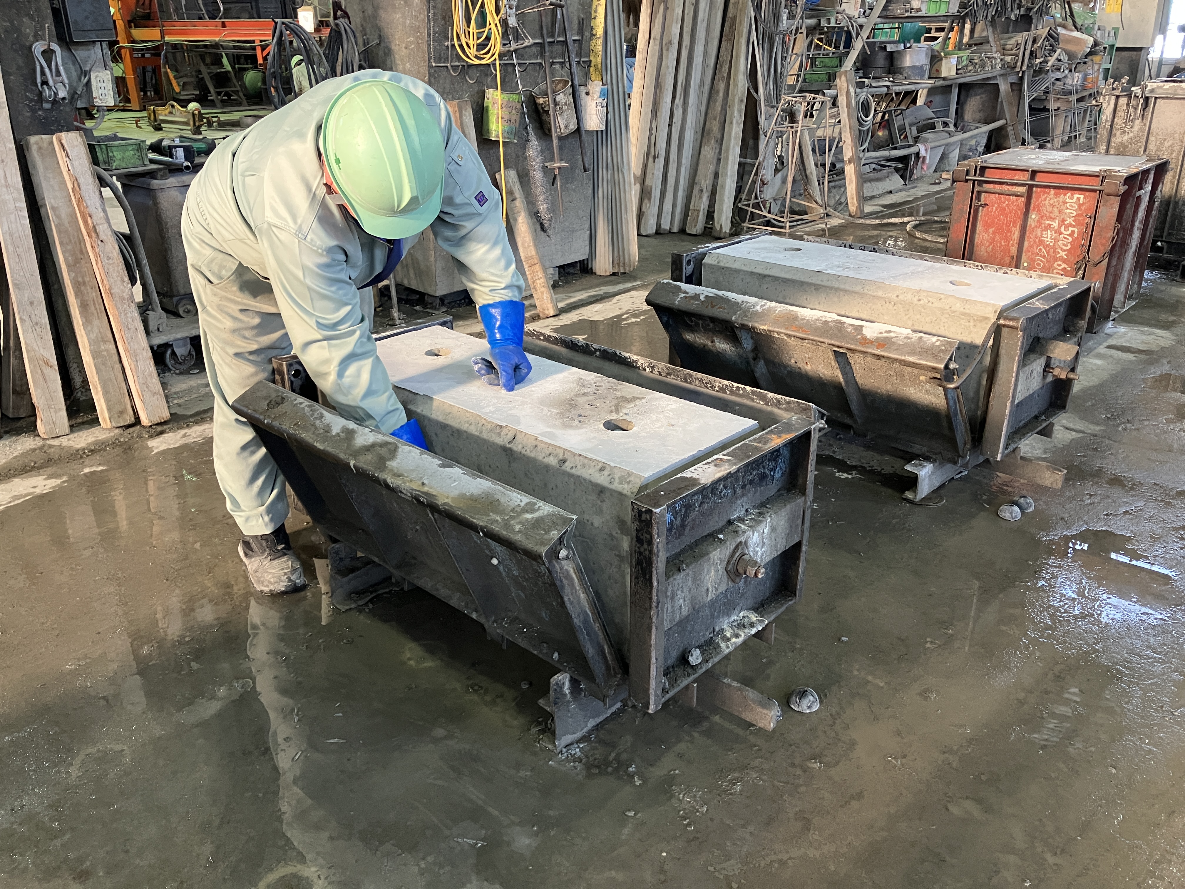具体的には型枠の清掃、組立、生コンの打込み(バイブレータで振動、締固め)、コテ仕上げ作業、養生(養生シート囲い、機械にて蒸気養生)