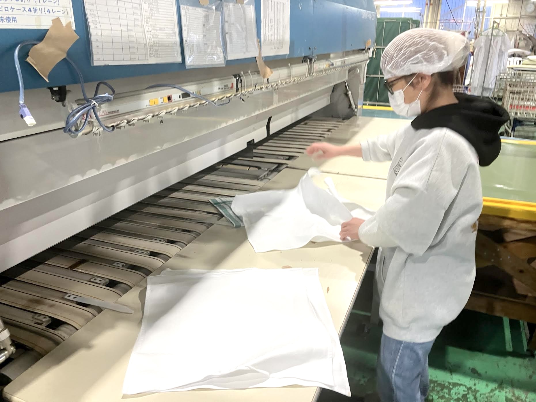 ◇洗濯・乾燥後にそれらがあなたの持ち場に運ばれてきますので、1枚ずつ手にとって仕上げ機(シワ伸ばし機)にセットしていきます。
