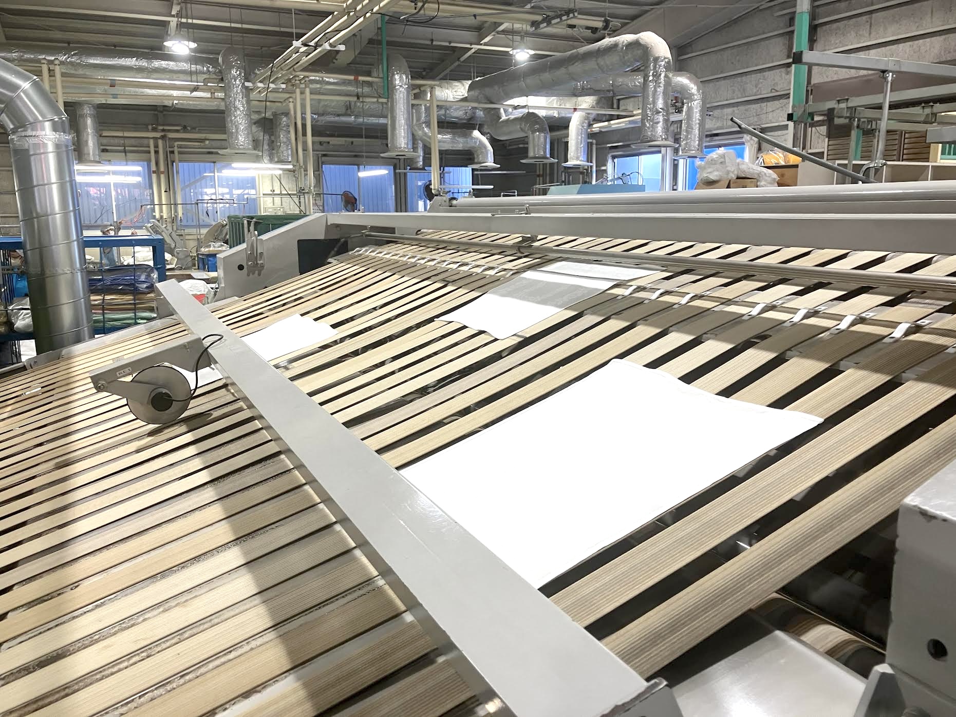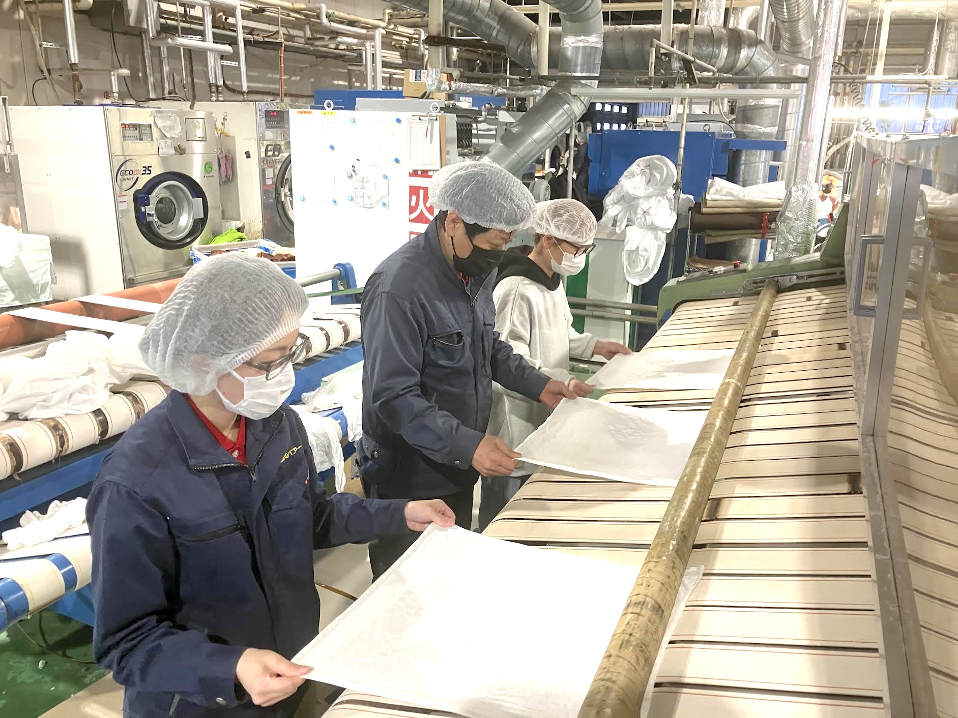 ◇セットされたタオル類はローラーでシワが伸ばされ、機械の後方に出てきます。キレイになったタオル類をまとめ、所定の場所に運びます。