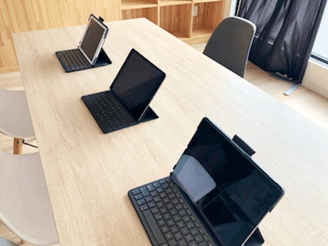 社員全員にiPadかノートパソコンを支給した上で、情報共有や書類作成を効率化も図っております。