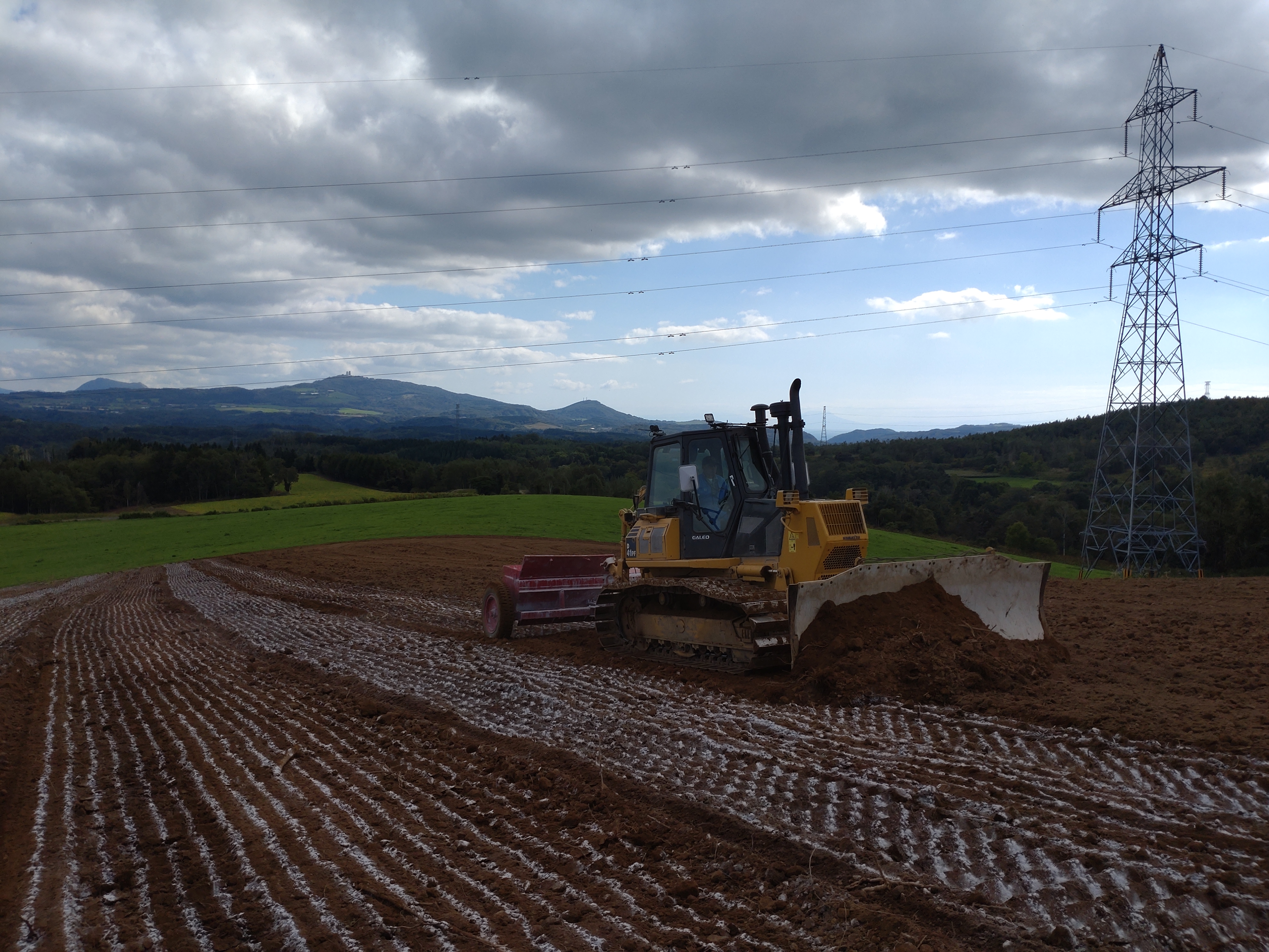 - 農地の造成、整備改良を行うため、ブルドーザーやホイルトラクター、 バックホウなどを使った運転業務とそれに付随する作業が主な仕事です。