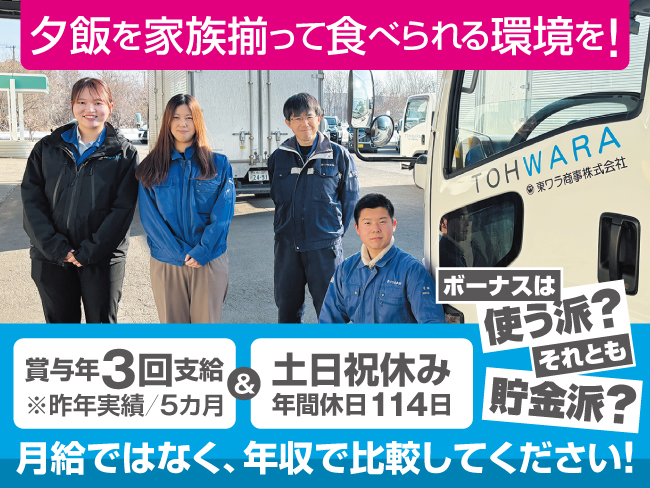 - 交通費実費支給(月24,500円迄)、役職手当、家族手当、燃料手当(年1回賞与時に支給)