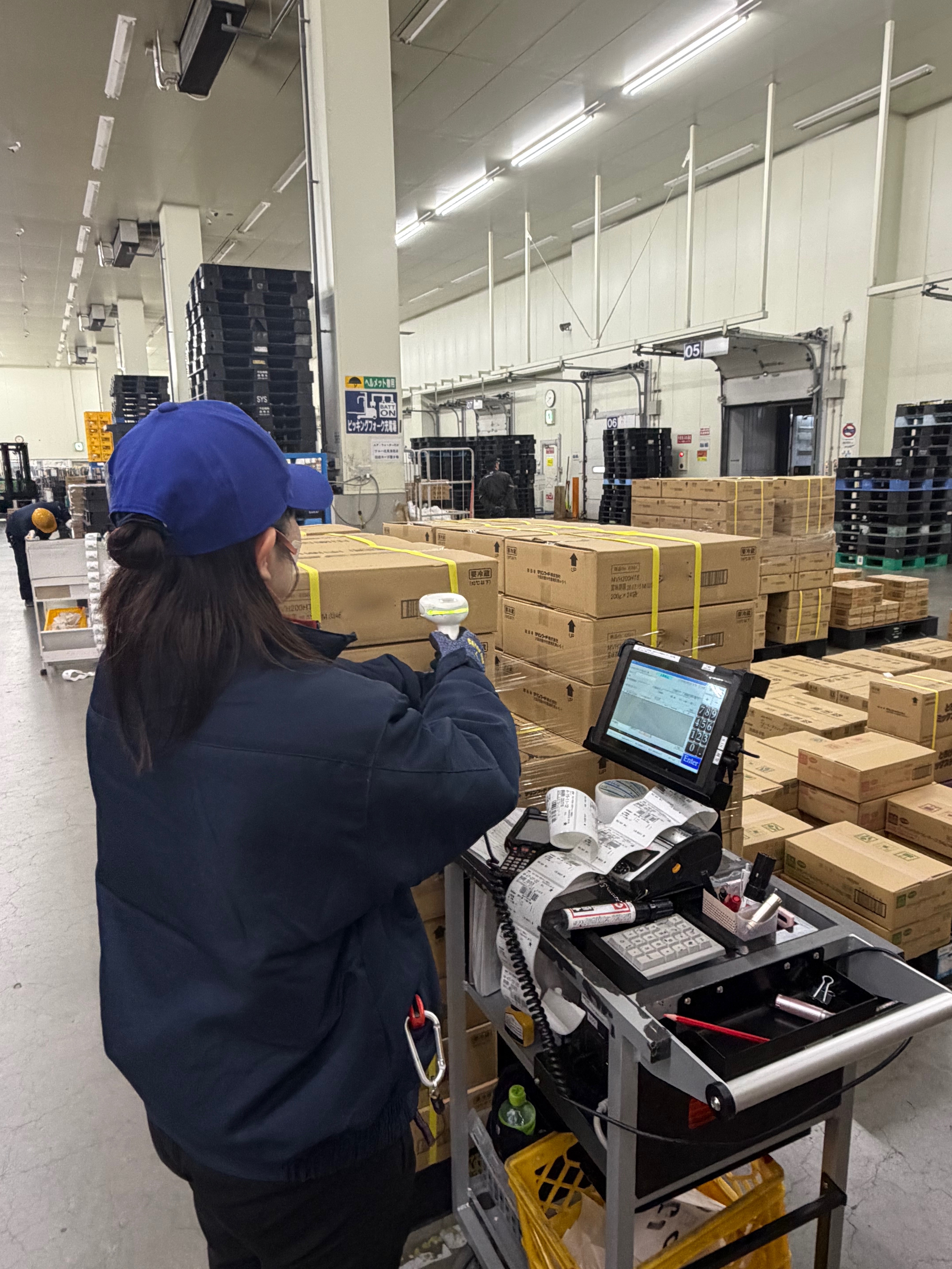 - 食品物流センター内での入荷商品(バターやチーズなどの乳製品や冷蔵加工食品)の検品作業です。