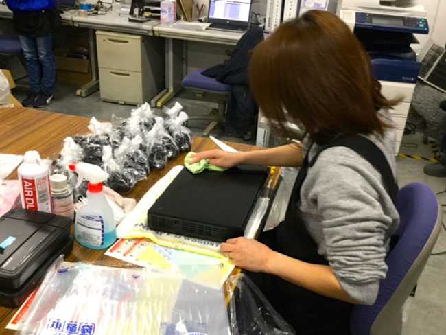 - J-COMのケーブルテレビ機器(ビデオデッキ程度の大きさ)を初期化して機器の汚れを落とし梱包します。