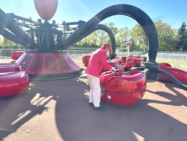 巨大迷路やジェットコースター、観覧車やメリーゴーランド、グリーンランドにある各種アトラクションコーナーにて、並び列を整えたり、回数券を回収したり、安全ベルトなどをちゃんとしているか目視確認したり。