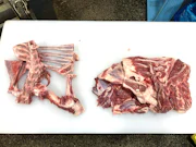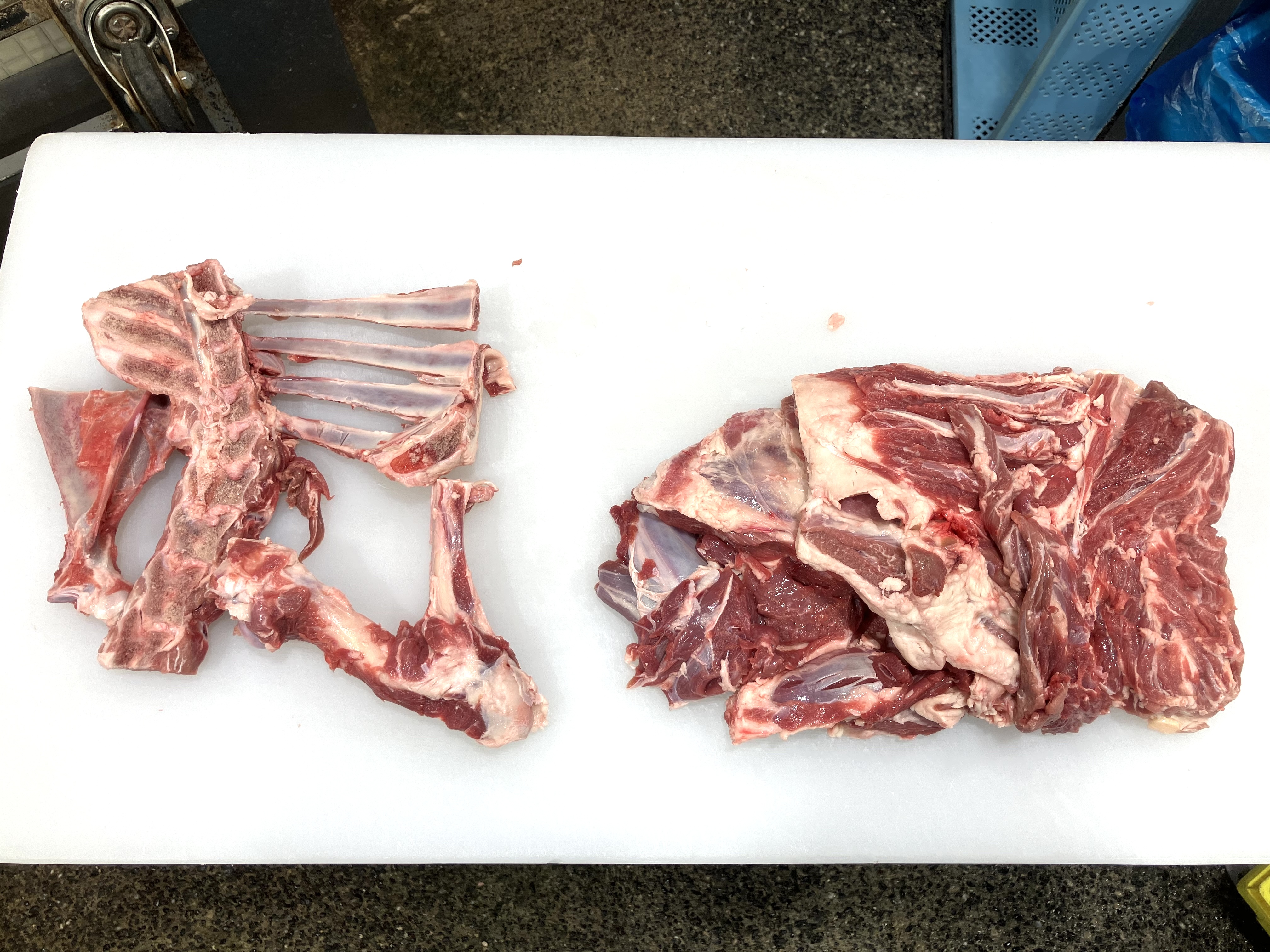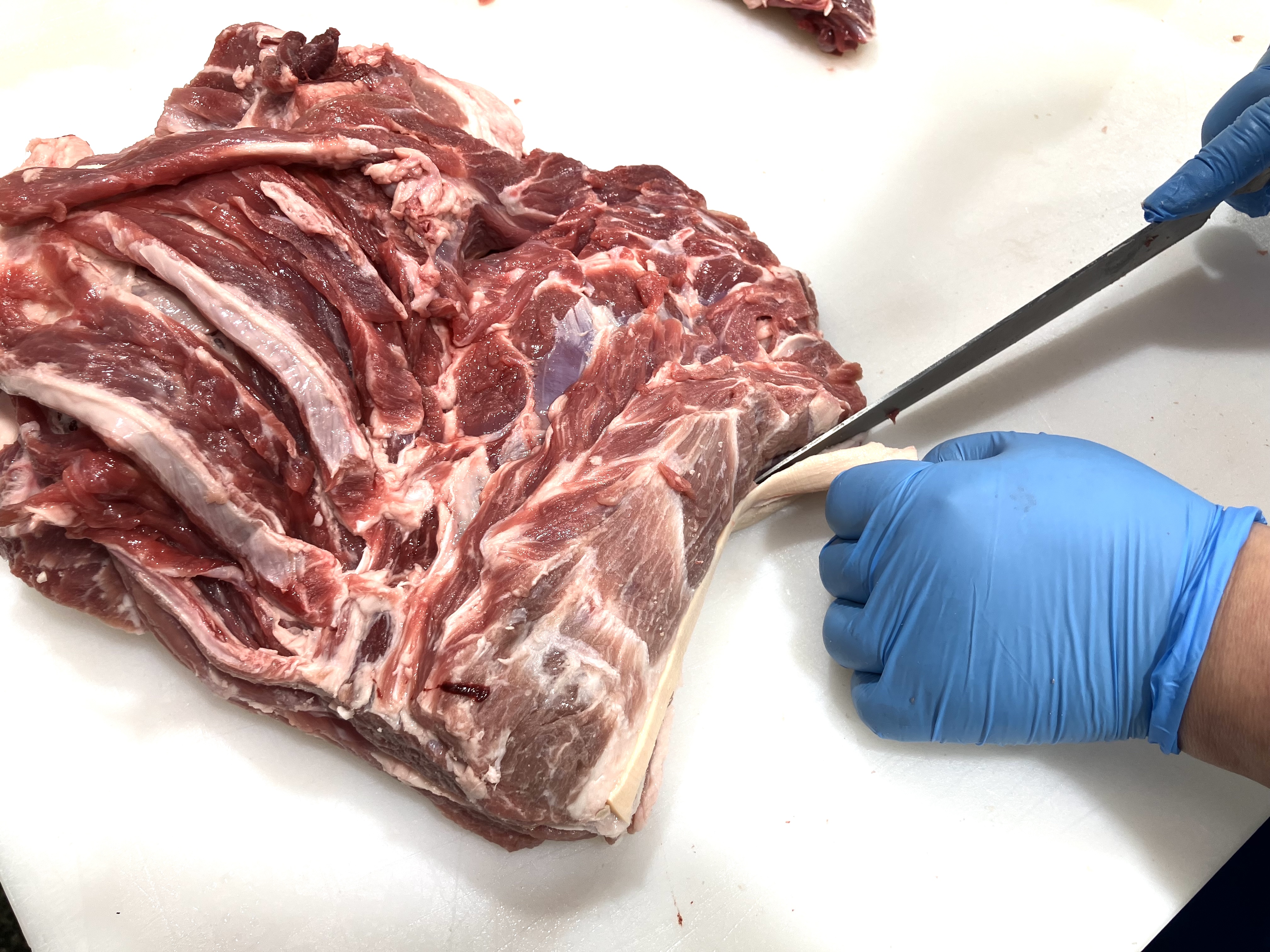 ◇はずし:ラム肉(肩肉)から専用のナイフで骨と肉に分けていきます。