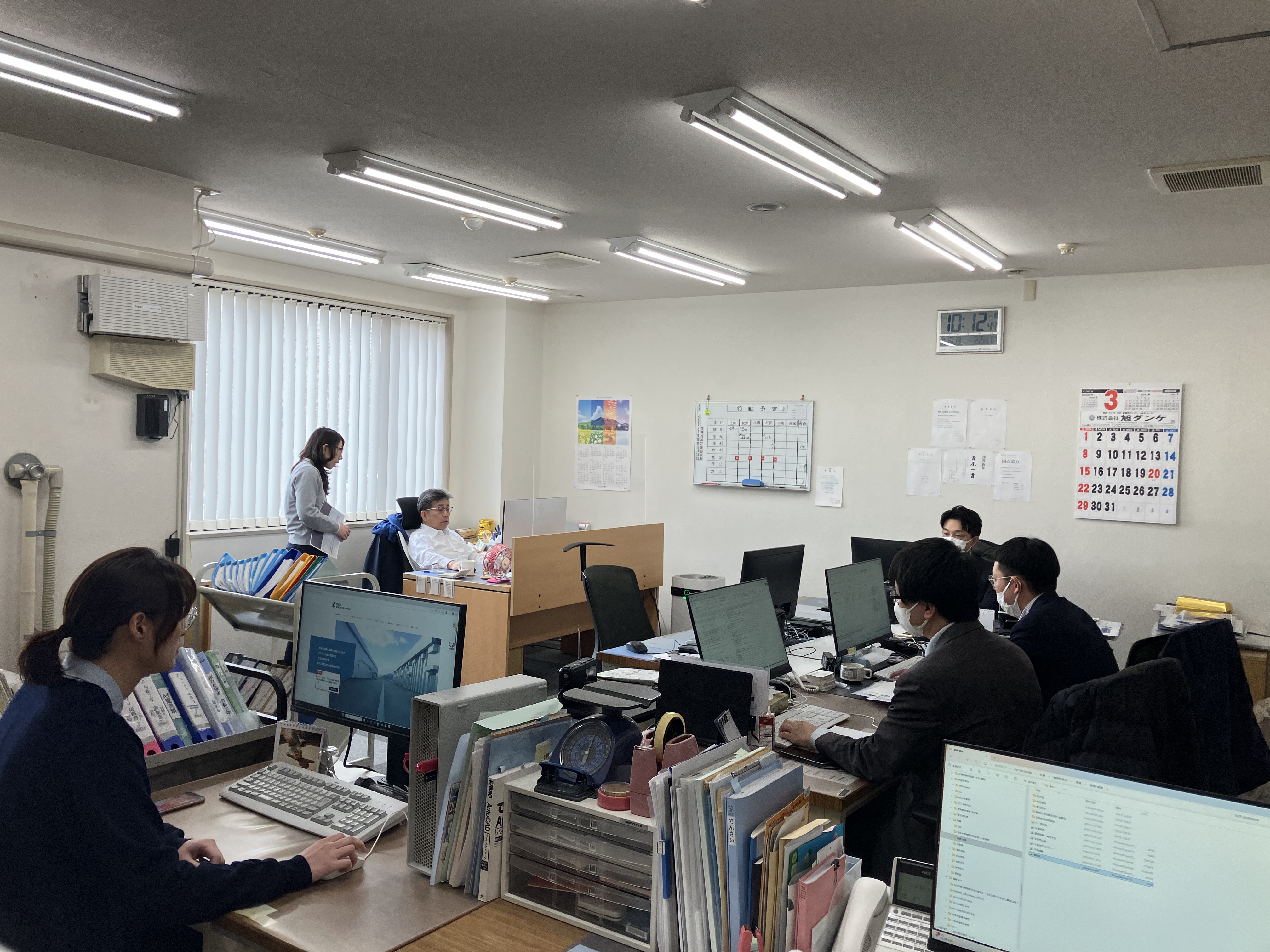 事務所全景です。現在は営業4名、事務1名、経理1名、代表1名の7名が在籍中。内・外での協力体制も整っています。