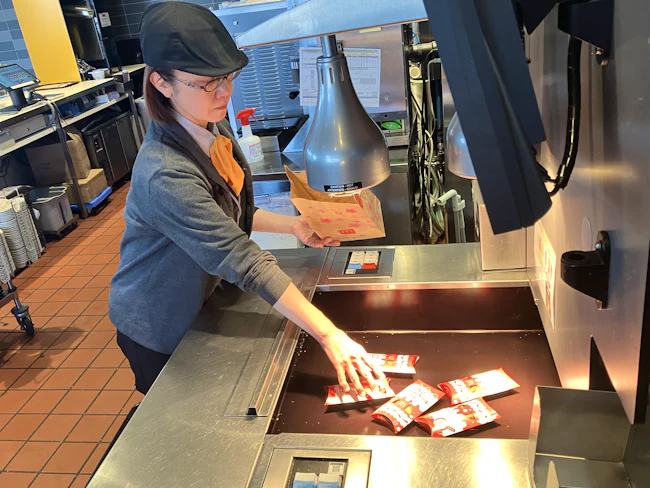 - ハンバーガーやポテト・ナゲット等の調理補助です。初めはバンズを機械に入れる簡単作業から。手順は全てマニュアルで決められており、未経験や料理が苦手な方でも簡単にできる仕組みになっています。
