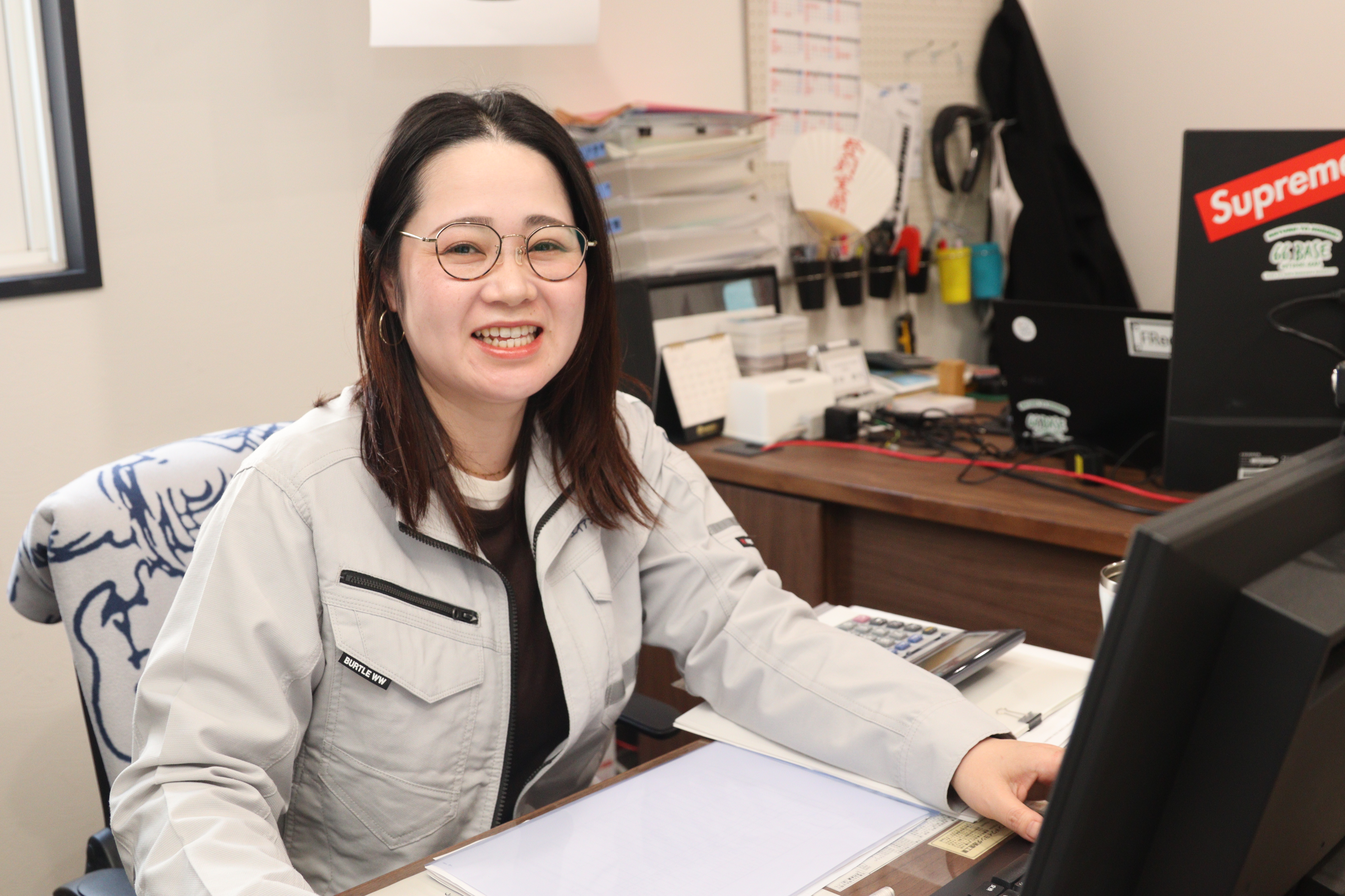 事務所では、現場から戻ってきた作業員さんと子どもの話をしたり、他愛もない雑談で笑い合ったりしています。普段は離れた現場にいるメンバーとも、釣り大会やキャンプ、焼き肉イベントなどを通じて交流できるのが楽しみの一つ。私が何気なく「あのキッチンカーのパン、おいしいらしいですよ」と話せば、社長が私や子どもの分まで買ってきてくれる……そんな温かい気遣いがある職場です。