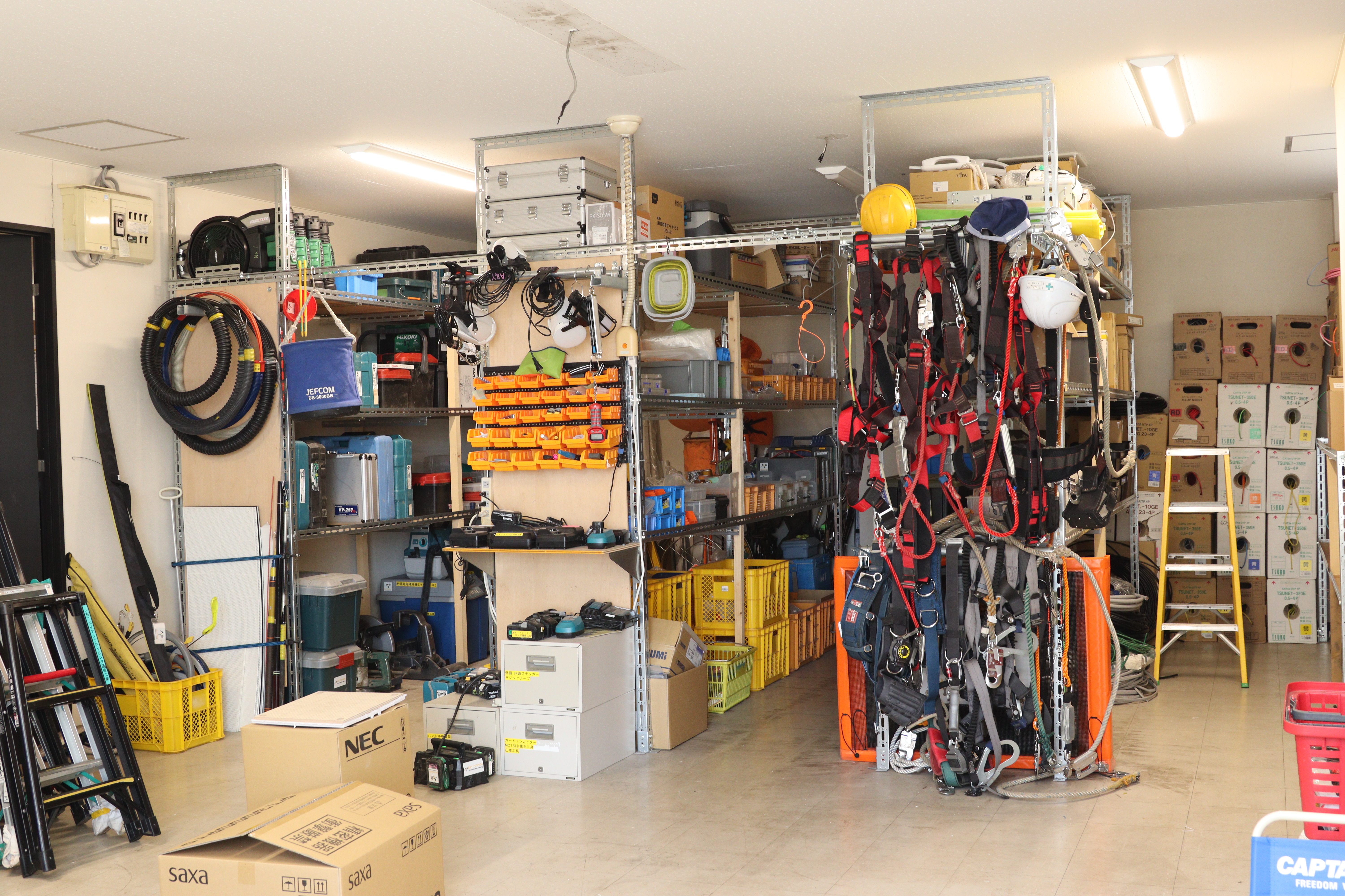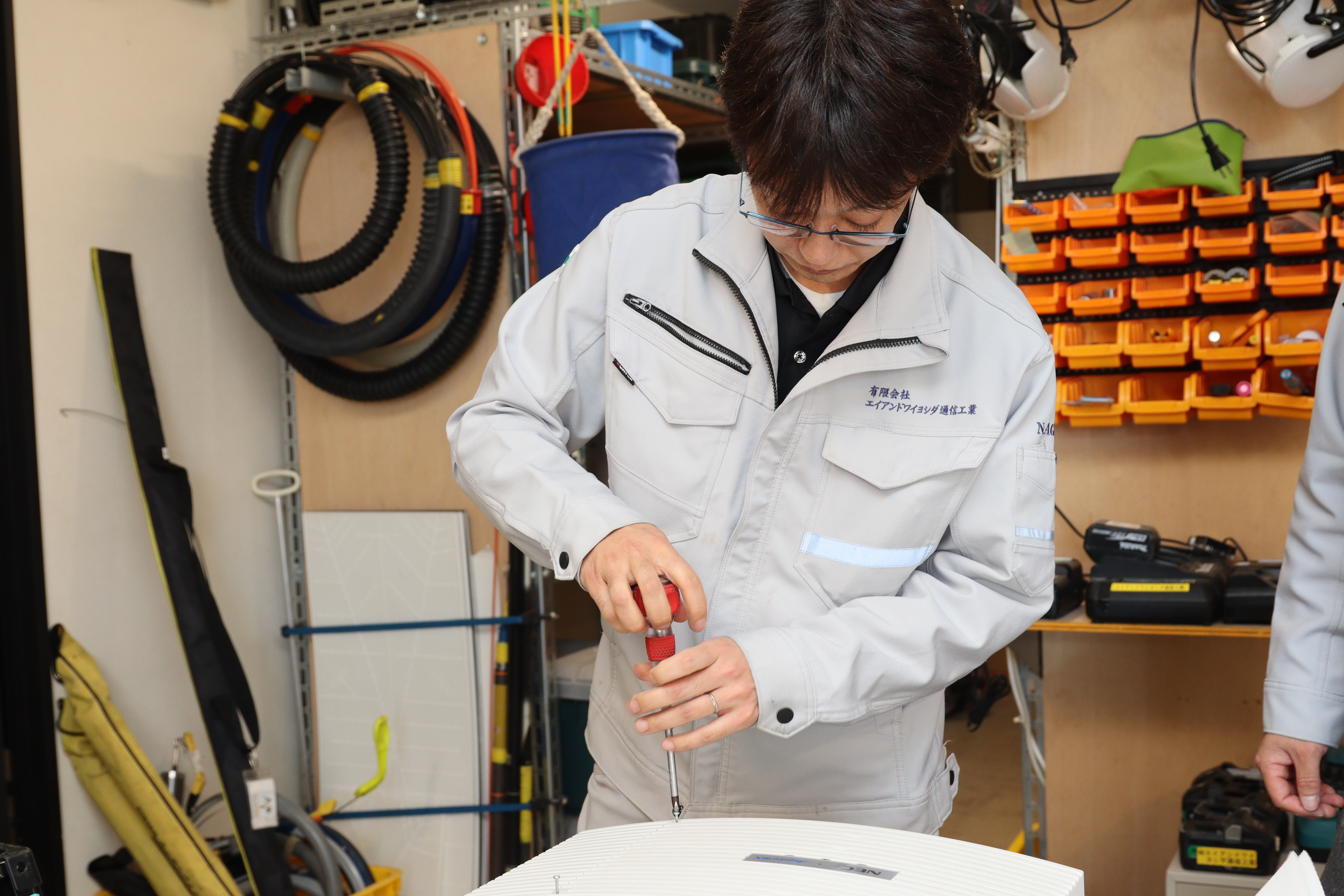 NTT関連の光ファイバー網構築や携帯電話基地局の設置、さらには防犯カメラやWi-Fi環境の整備まで、設計から施工・保守までを一貫して手がけています。