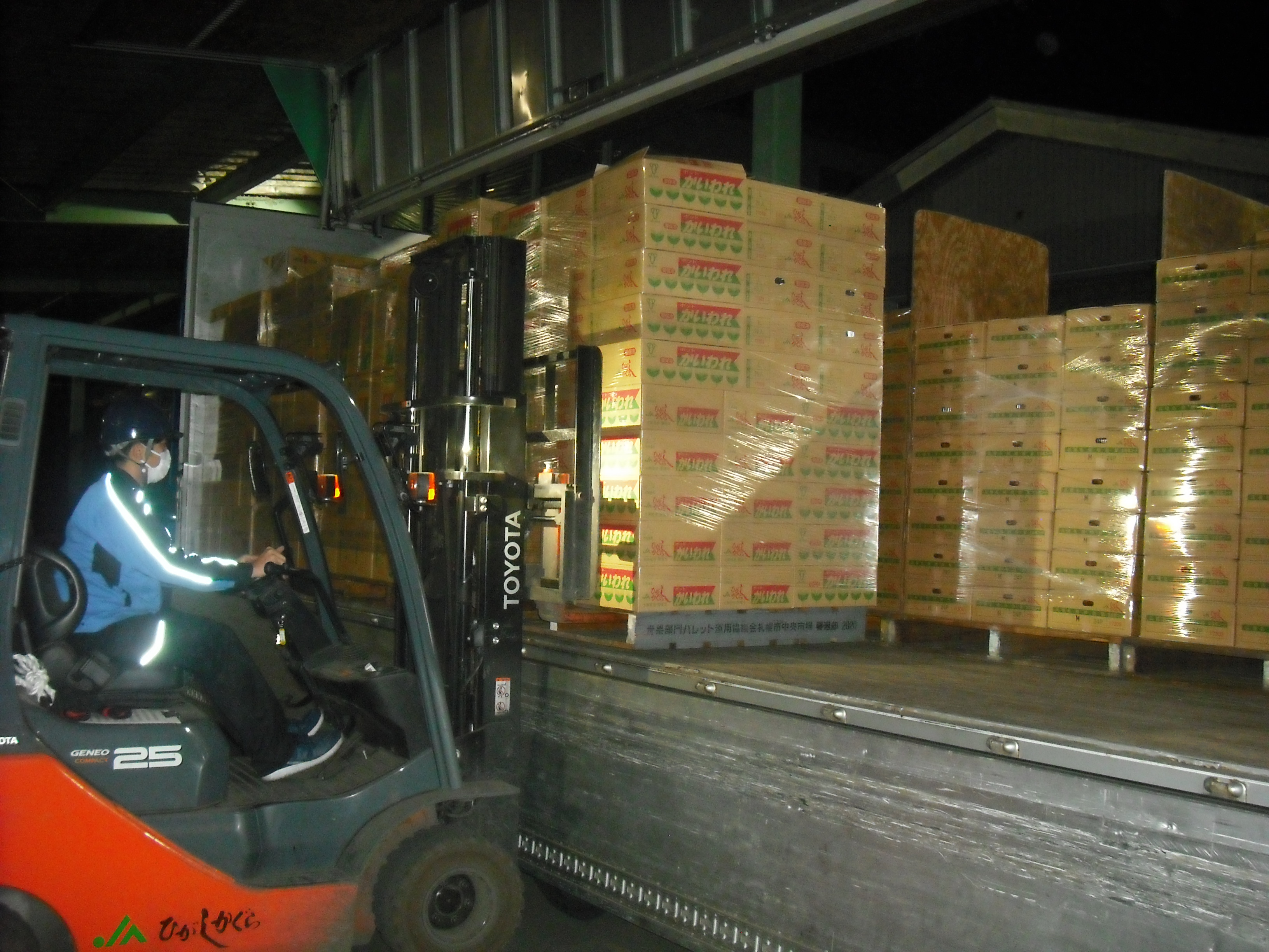 一見すると手積み・手おろしの肉体労働に思われがちですが、パレット化やフォークリフトの活用を進めることで、安全かつ効率的な作業を実現しています。