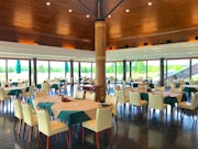 落ち着いた雰囲気で、窓の向こうには一面ゴルフ場が広がっています。多くの観光客やゴルフ利用者のお客様が利用されます。