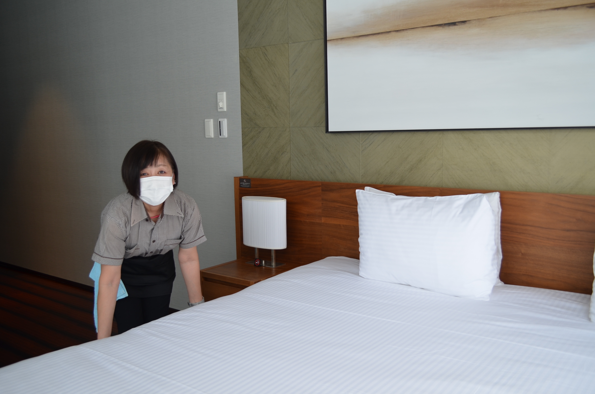 ベッドのシーツを剥いだり、客室清掃をしたり、アメニティを補充したり等全般作業をお願いします。難しい作業などはありません。