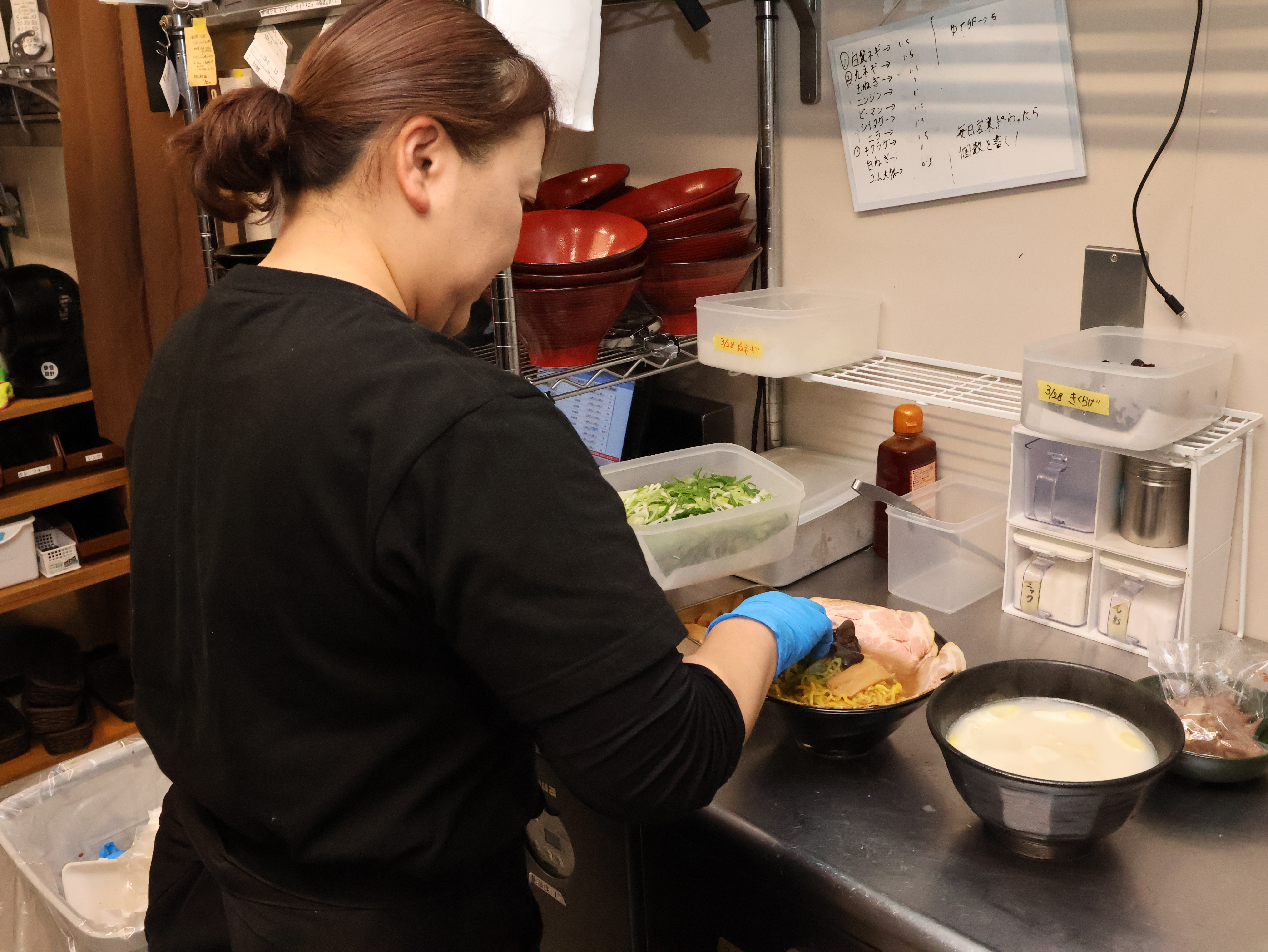 (麺を茹でる、トッピングの盛り付け、サイドメニューの盛り付け。メニューごとに作業はわかりやすく整理されているので、流れを覚えれば難しいことはありません。)