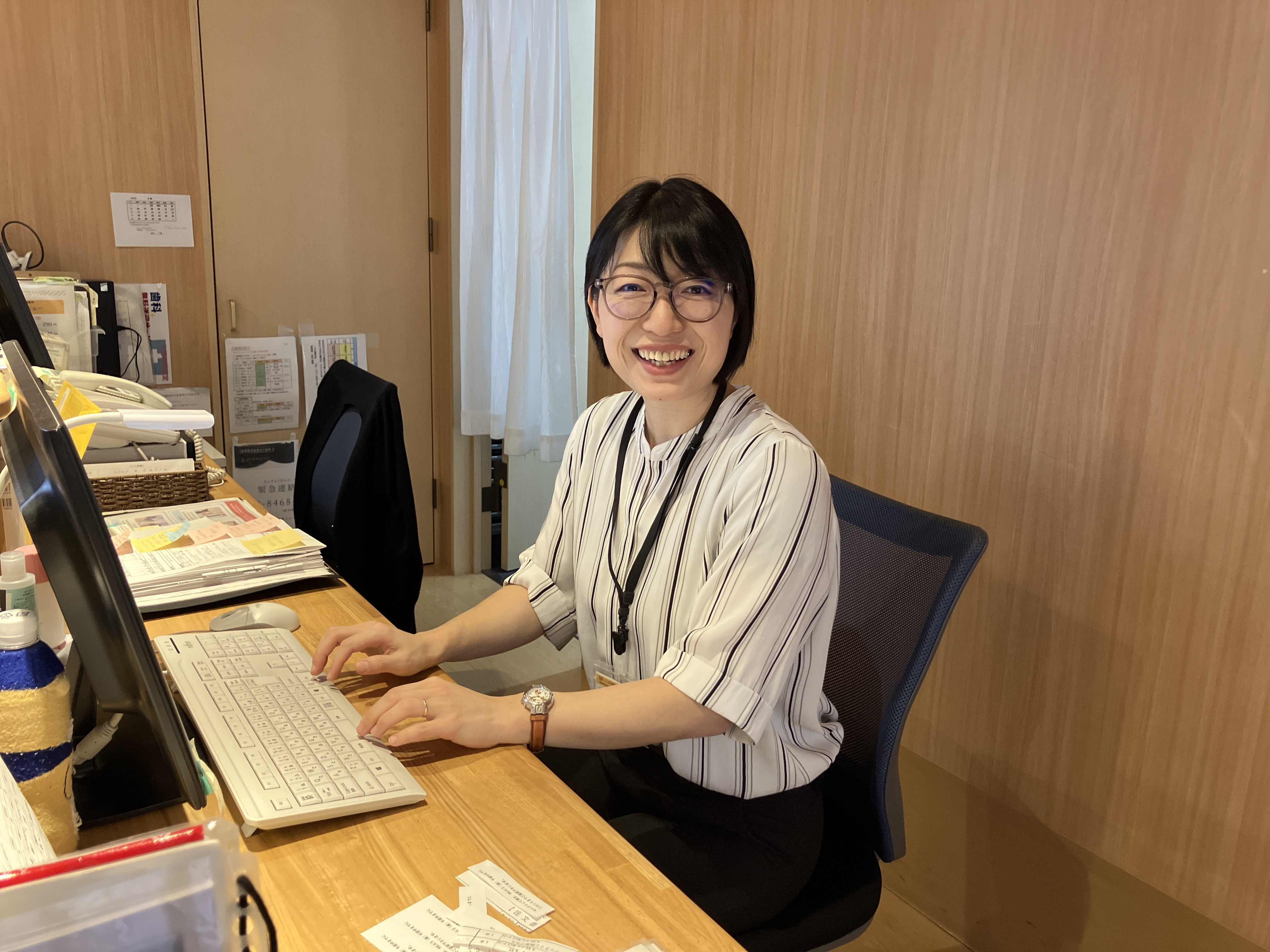 施設のフロントにデスクがあります。仕事はひとつづつお教えします。