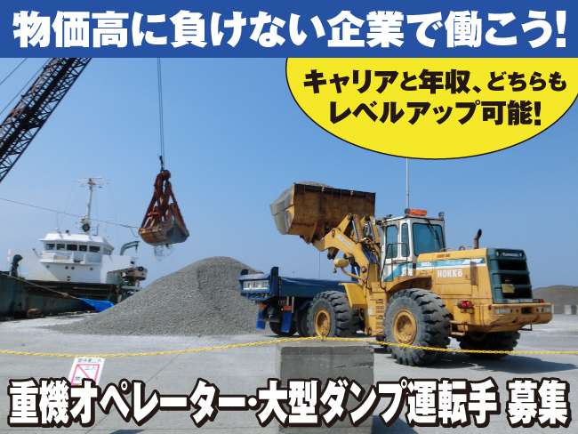 船で運ばれてきた砂・砂利などの商品をこの大型ショベルでダンプに積み込み作業を担当。重機作業はセンスが大切!男女問わず経験が浅くても、機械大好き、チャレンジ精神のある方、あなたのセンスを見せてください!