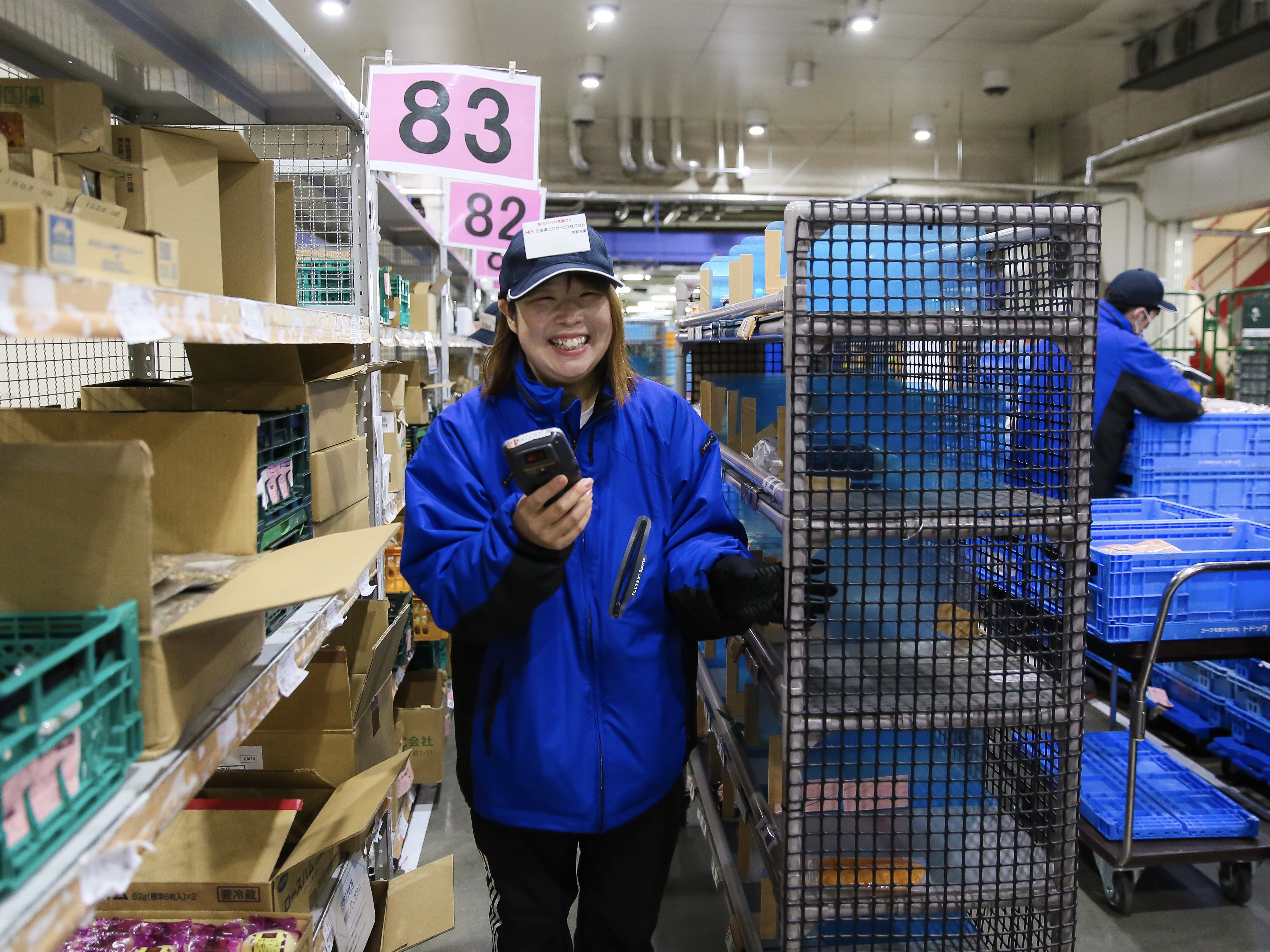車輪付の専用棚カゴをあなたの隣に置いて、商品をどんどん入れていきます。スピードにとらわれることなく、まずは正確に着実にやっていきましょう!難しい内容の仕事ではないので、すぐに慣れますよ。