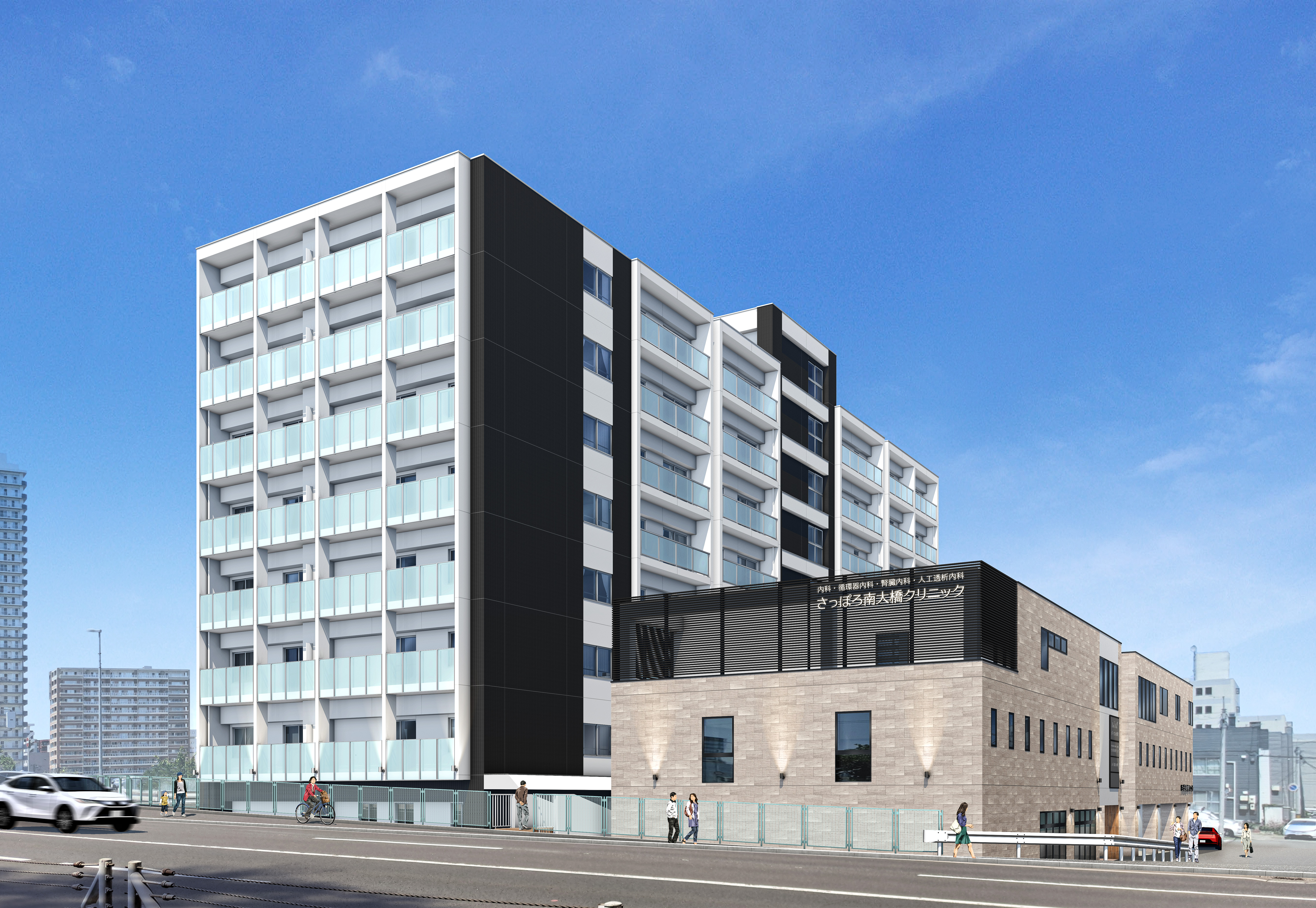 勤務先の「パークウェル水車町」です。最上階の9階から見る札幌の街と山並みが素晴らしく、朝早くからその風景を眺めにくる入居者も多いんですよ。