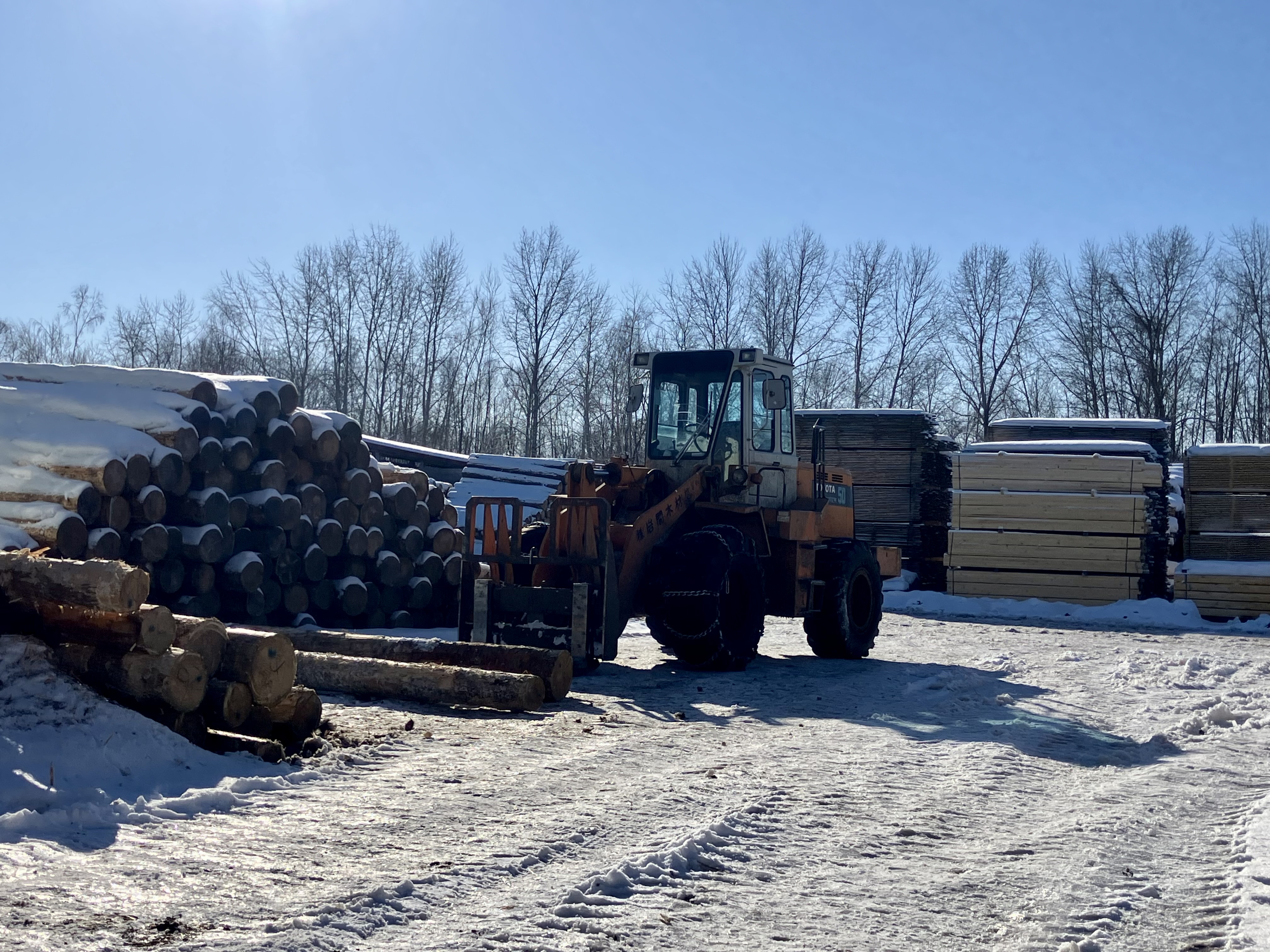 ショベルローダーを運転操作して、土場および工場の原木(丸太)・製材を管理する作業に従事していただきます。