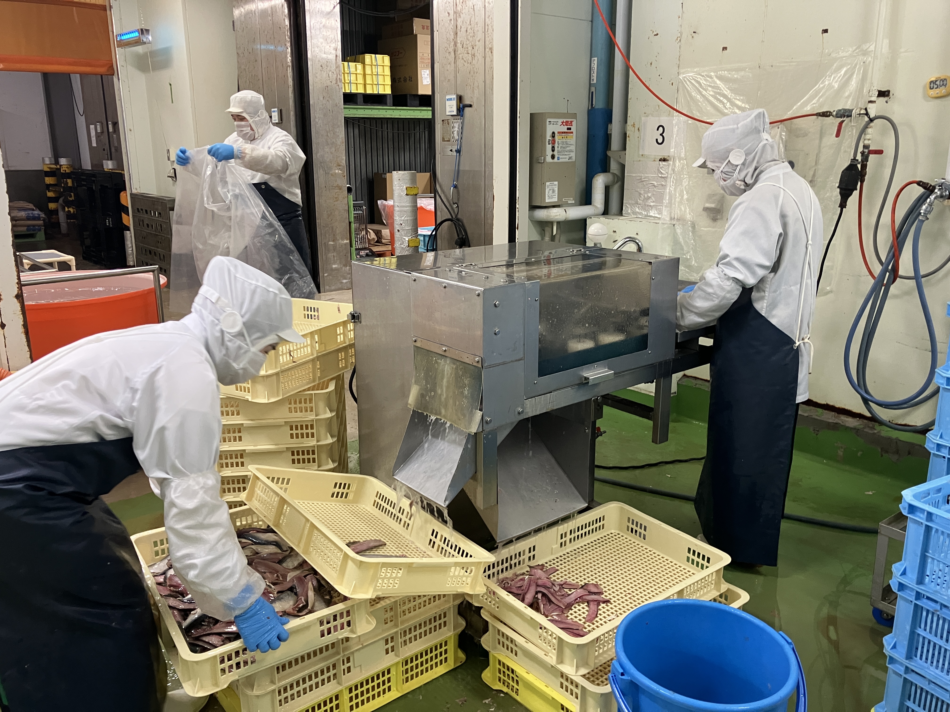 ◇下準備(取り回し)/勤務している契約社員や実習生が加工するための下準備(解凍作業、保管庫に移す作業、カットテーブルに魚を載せる等)
