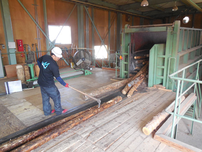 - ドラムバーカーと言われる皮むき機から出てきた丸太をベルトコンベアーに乗せる作業です。手作業(3人)で行います。他、機械のメンテナンス等の付帯業務。