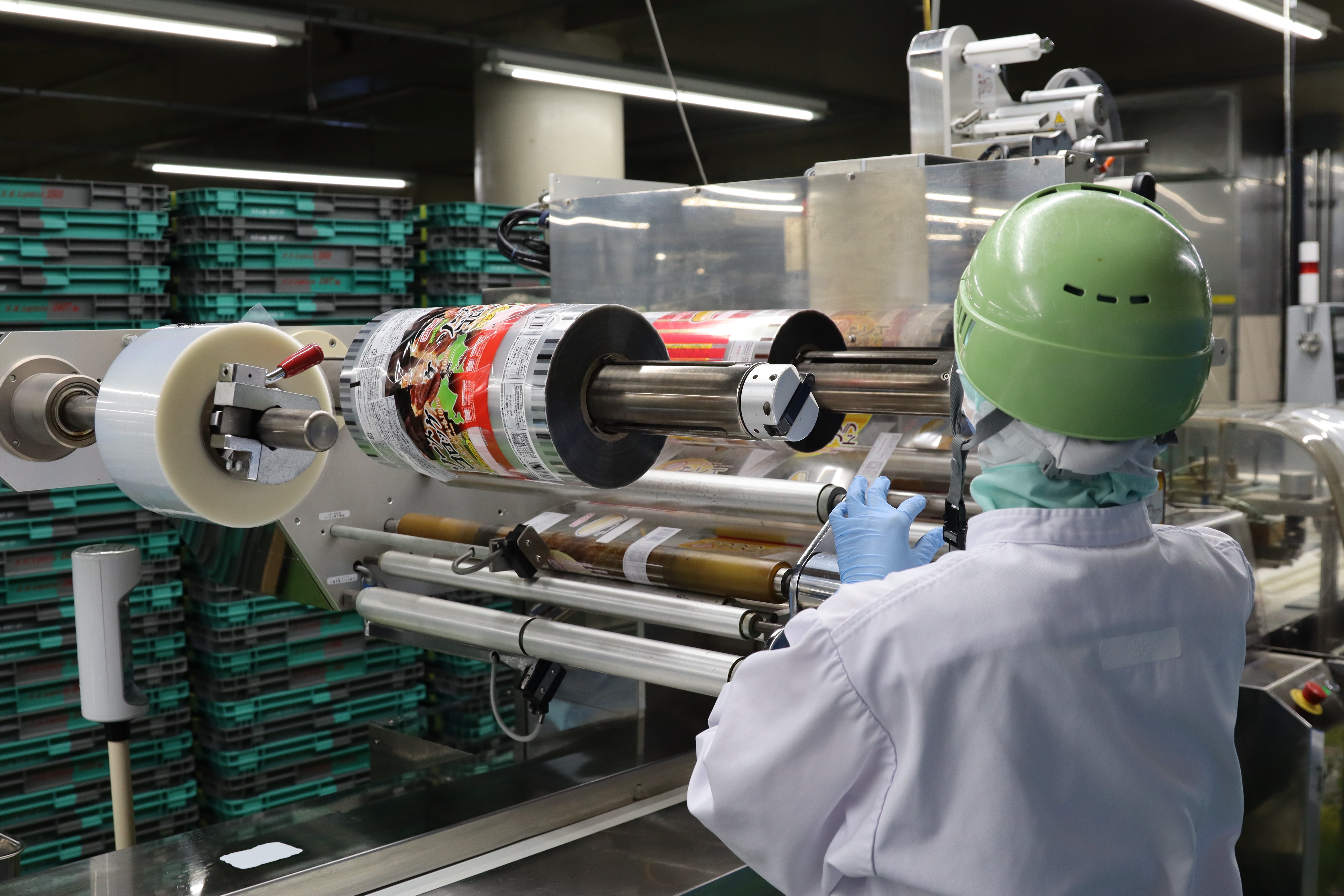 出来立てのパンが包材に入り、パン箱が積み上げられています。広い場所に沢山のパン。パンの数に応じた働く仲間が、沢山います。