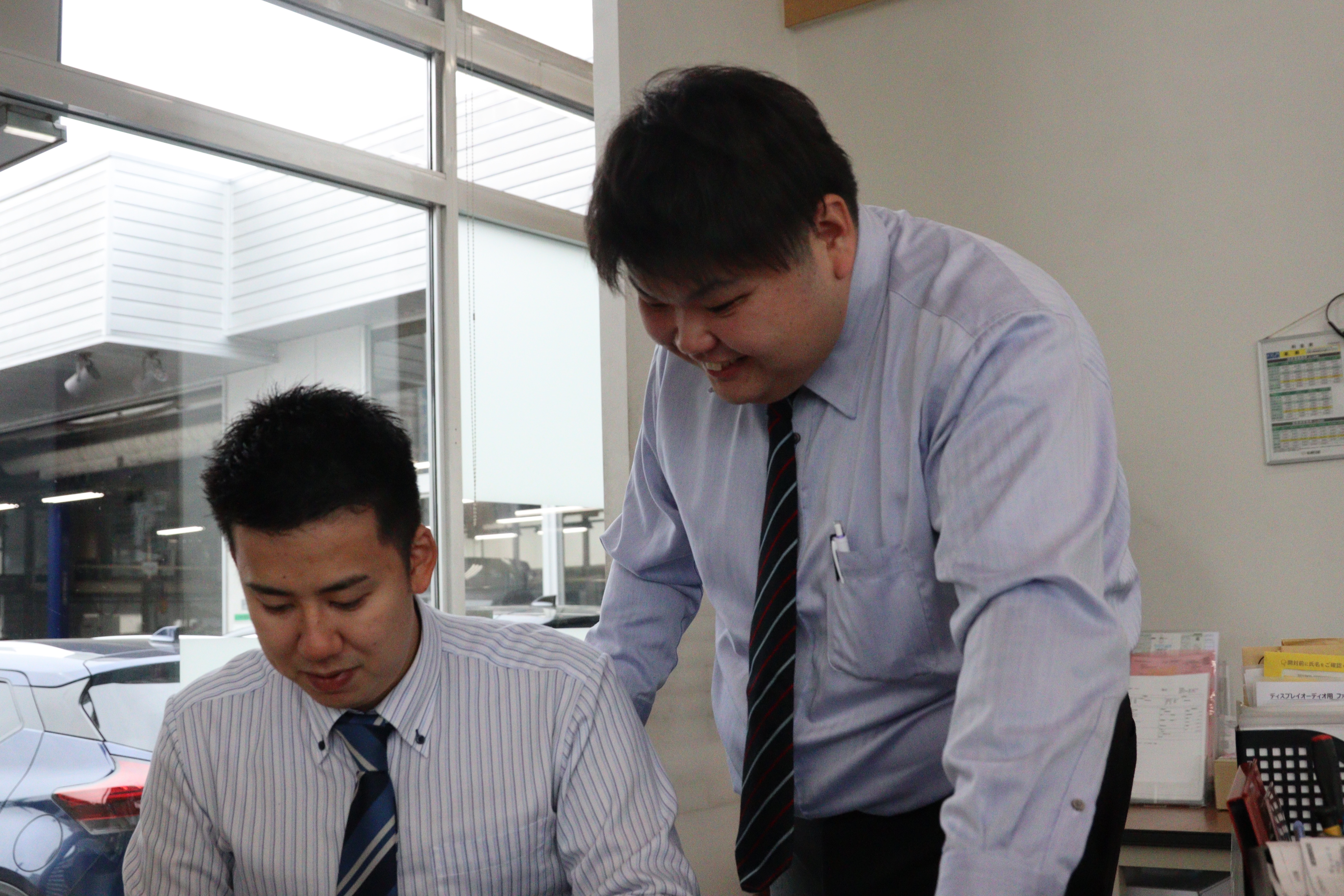 お客様から整備の依頼を受けることもありますが、同じ店舗内に整備担当がいるため、すぐにプロに繋ぐことができるのも安心ポイント。職種を超えた連携には自信があります。