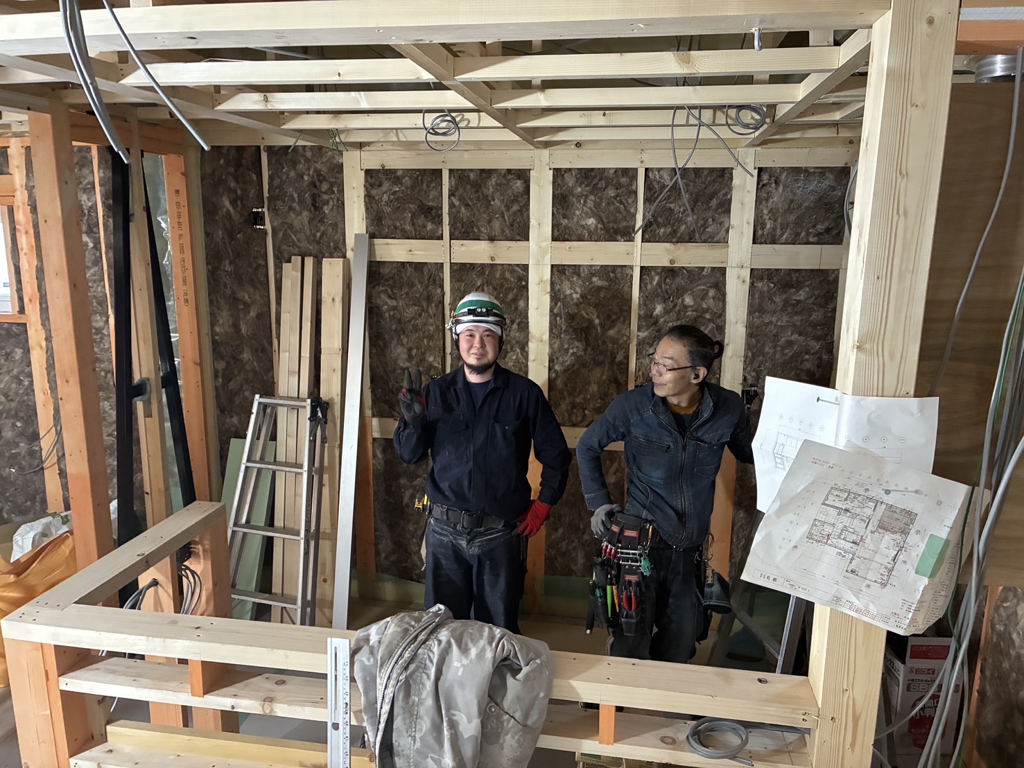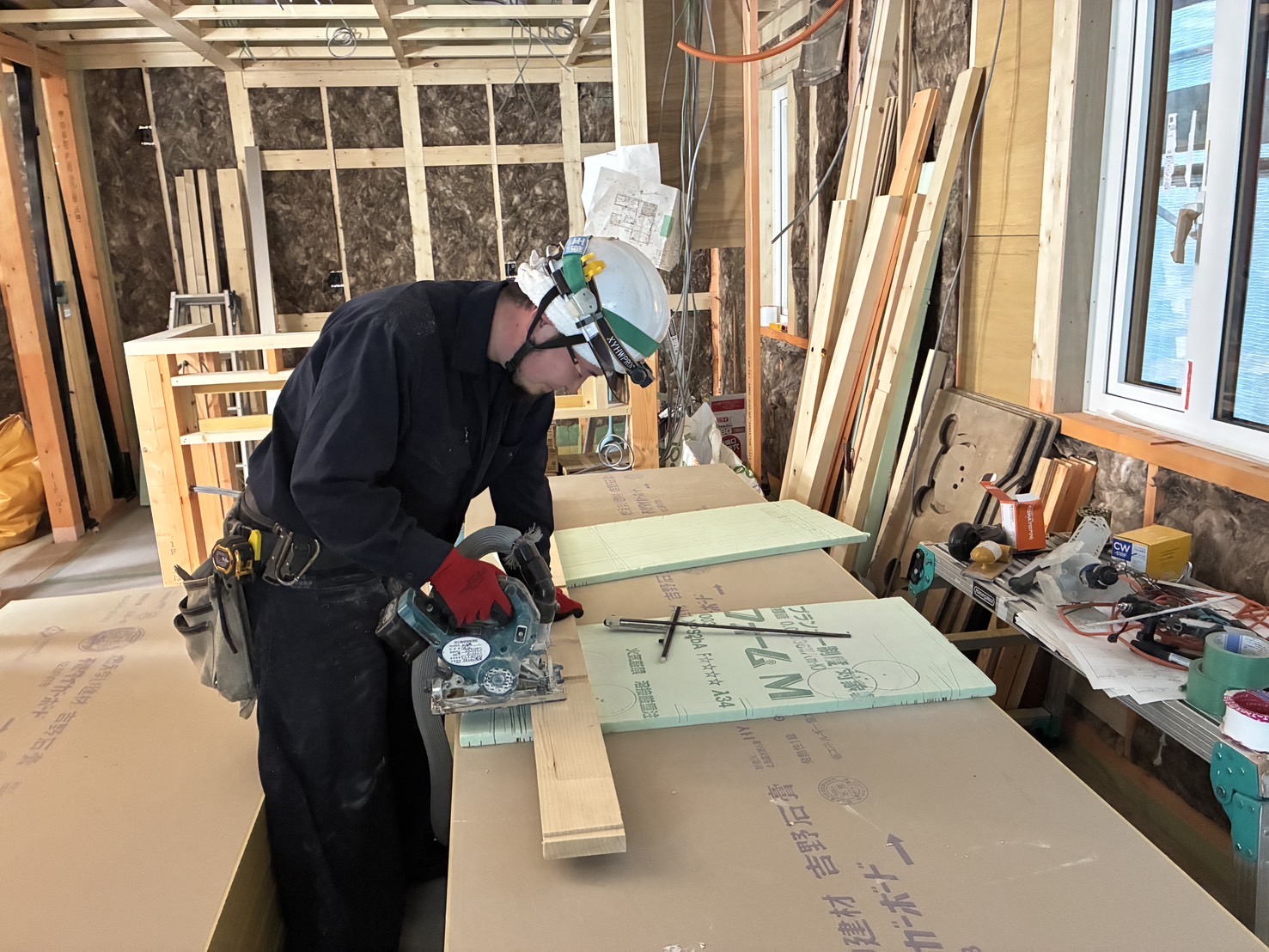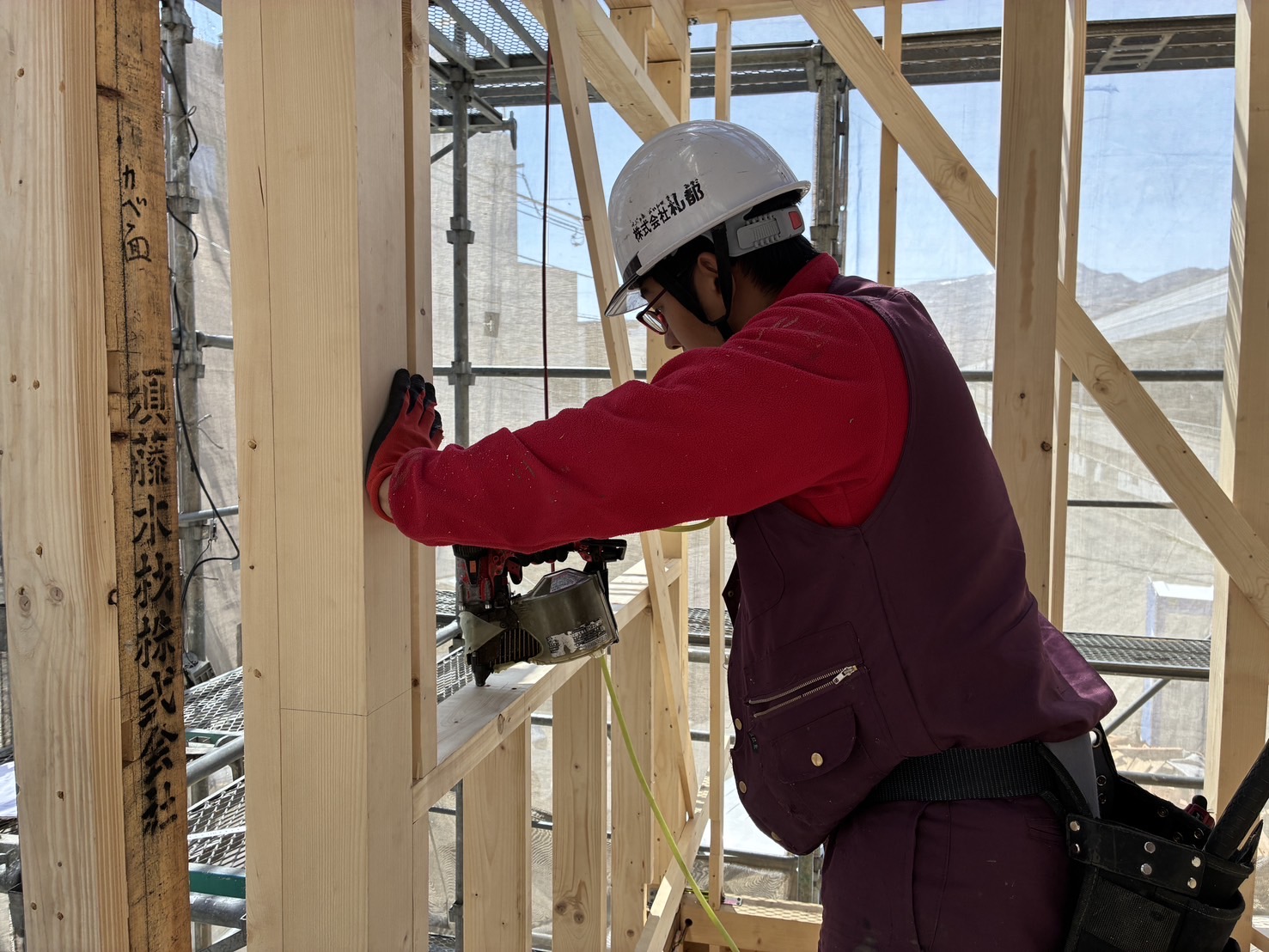 - 住宅建築現場での大工作業。資材運搬・片付け作業等の見習いからスタートし、骨組・土台ひき・ドア枠や壁づくり等の仕事を覚えていきます。