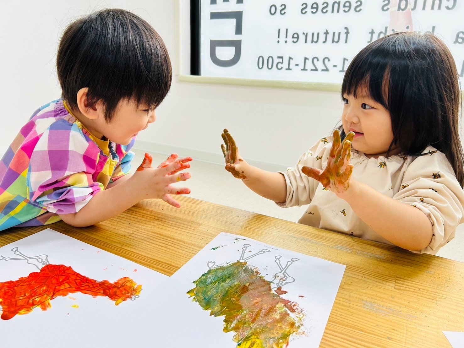 五感に基づく独自のカリキュラムを展開。視覚・聴覚・嗅覚・味覚・身体感覚を刺激するためフラワーアレンジメントやフィンガーペイント、クッキングや習字など体験・挑戦に注力しています。