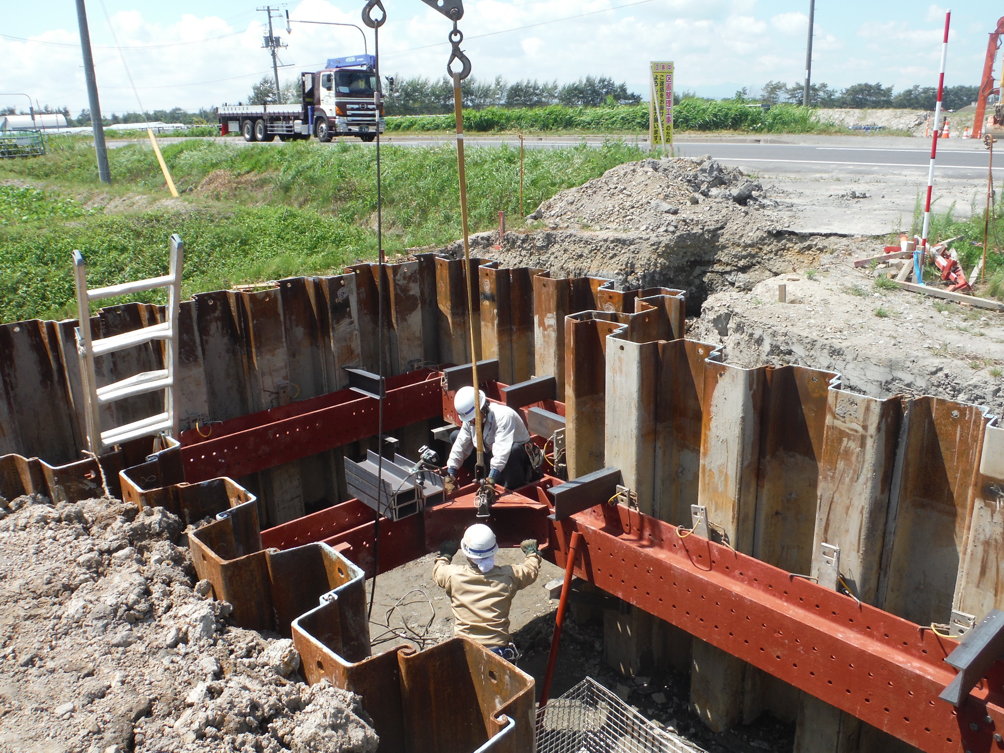 ◇工事のために掘った周辺が崩れないように留める作業(山留支保工架払)