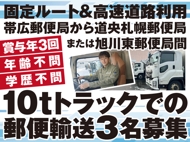帯広郵便局から道央札幌郵便局または旭川東郵便局間の固定ルートで、高速道路を使用するため、複雑な配送先の心配はありません 。