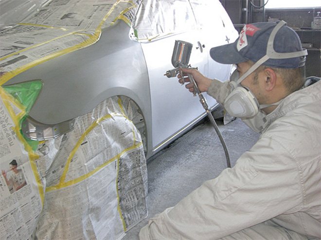塗装作業の風景です。板金スタッフと塗装スタッフは連携して、業務を分担して行っております。