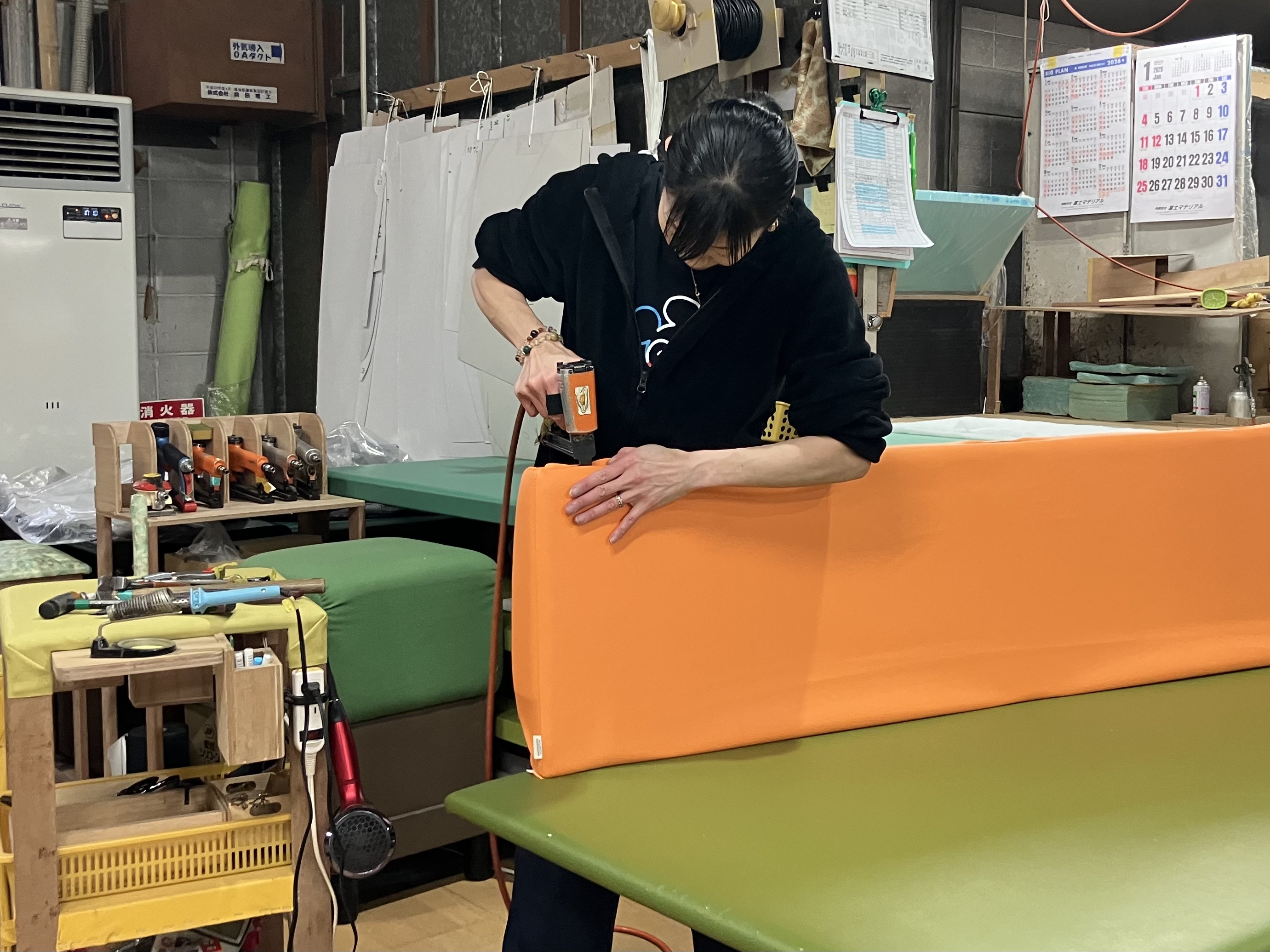 作業に慣れてきたら、これらの工程を終えた木枠に布やレザーを張って、タッカー(大きなホチキスのような道具)で固定する作業もお任せしていきます。