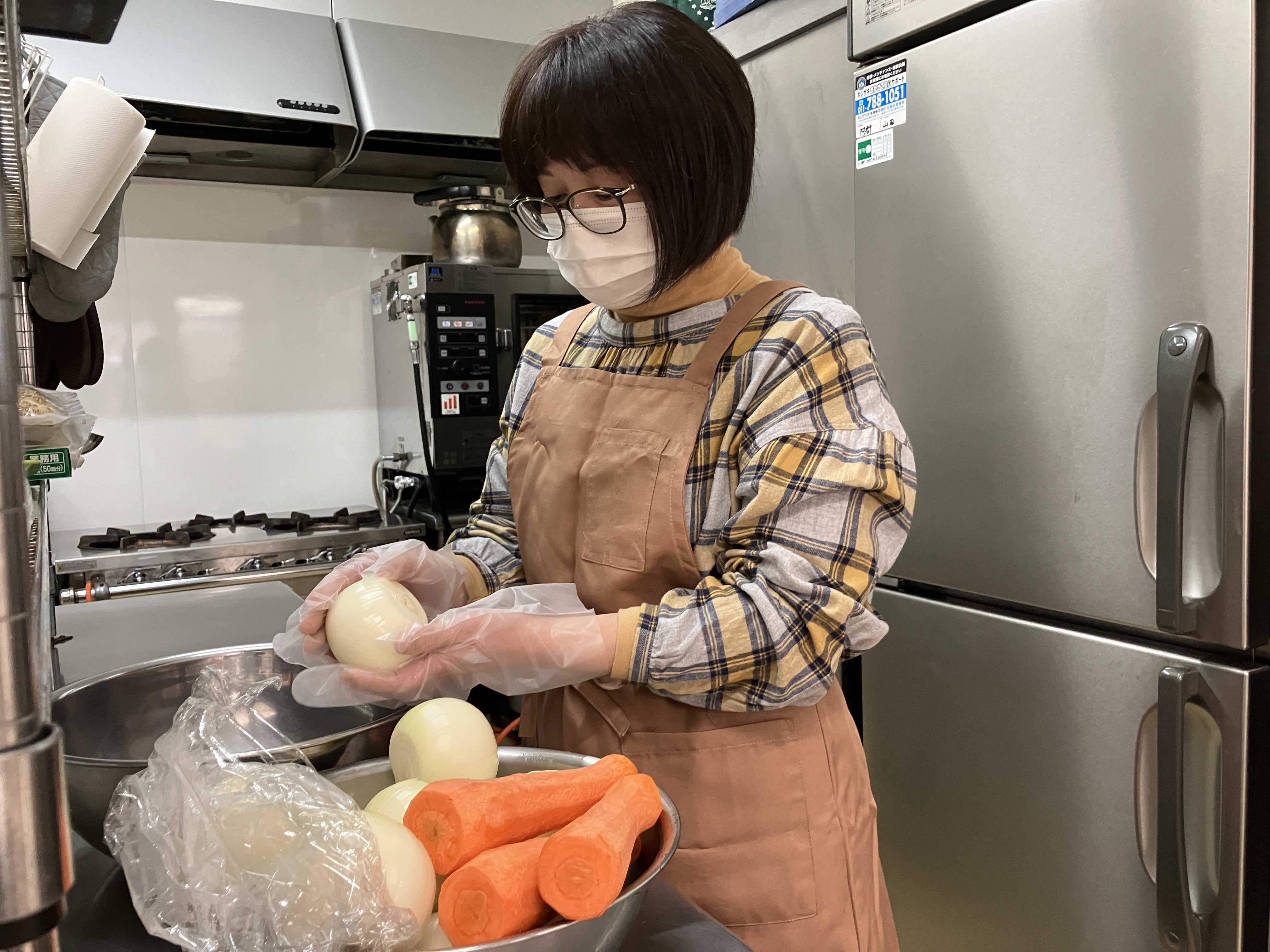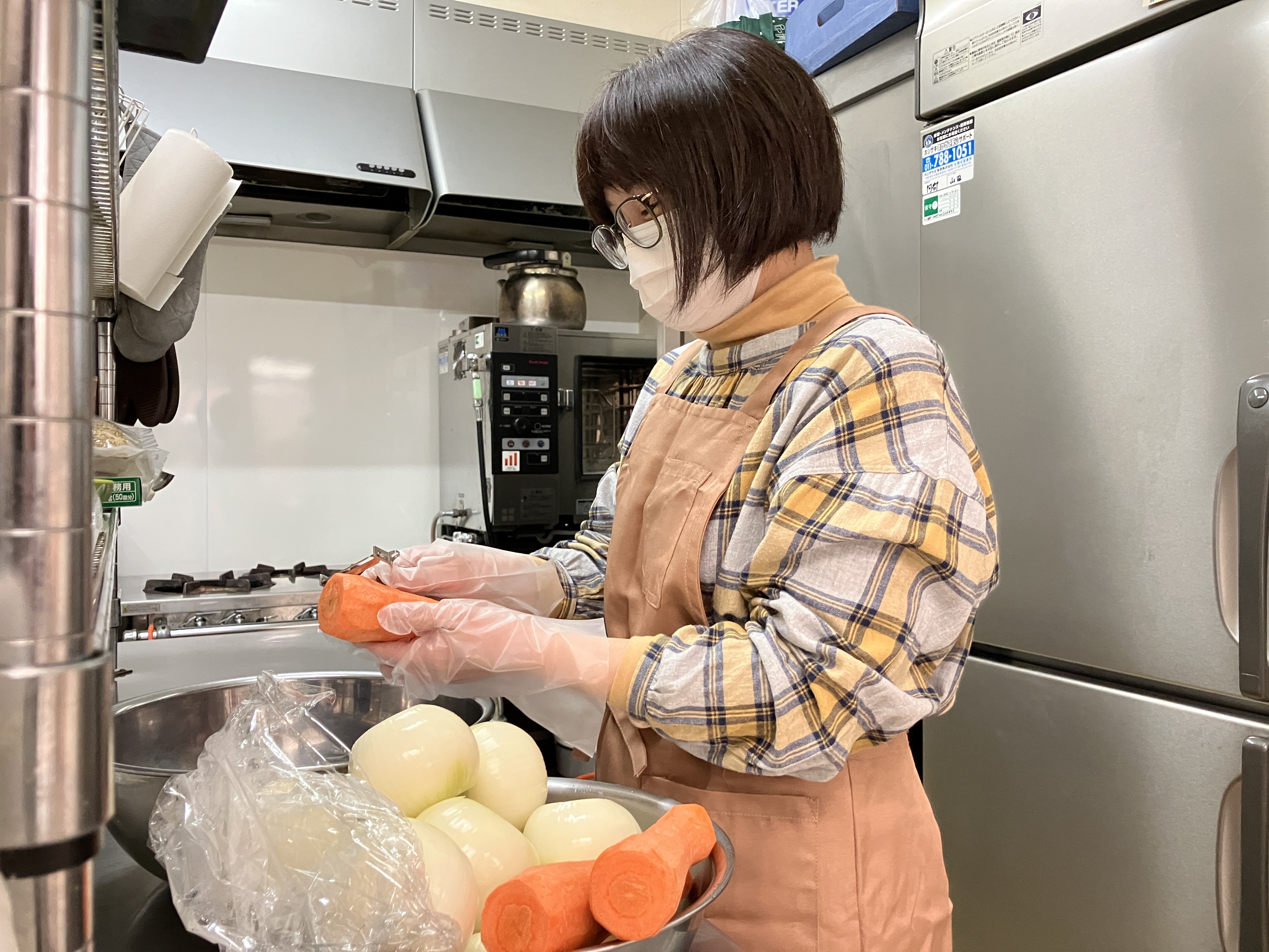 こちらはカレーの具材の皮むきをしている風景。ある日は「カレー+スープ」ある日は「オムライス、豆サラダ、お吸い物」など、作るメニューも難しいものではありません!