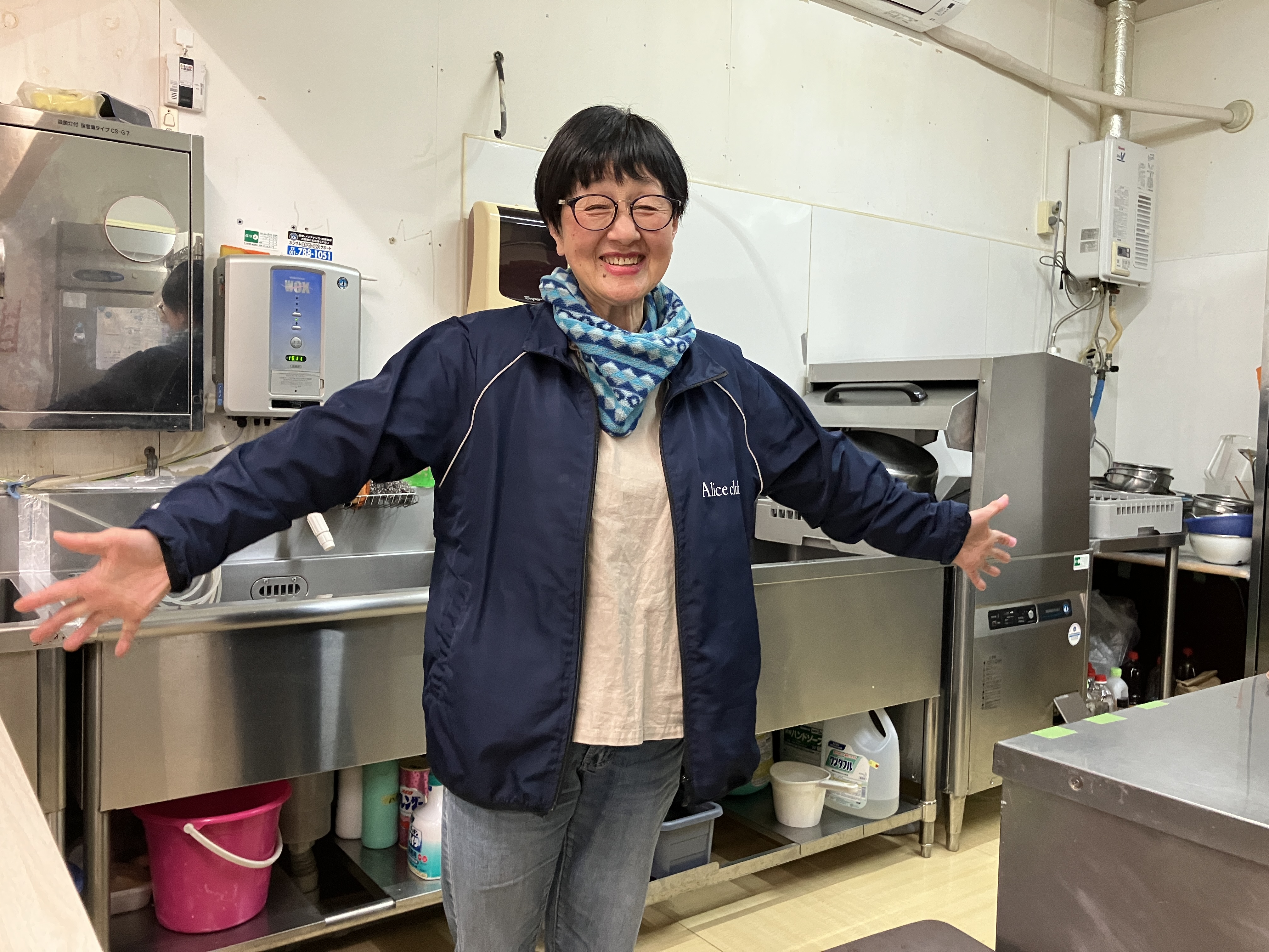 「こちらの厨房で勤務していただきます!一緒に働くスタッフ達もおっとり穏やかなメンバーなのでご安心を。事前の職場見学もOKなので、まずは職場の雰囲気を見に来てもらえると嬉しいです!」と語る代表の上村さん♪