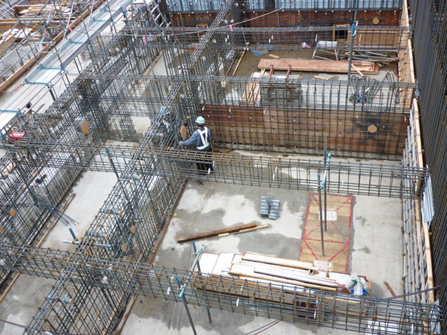運び込まれた鉄筋を、図面通りに配置していきます。柱、梁(はり)、床(スラブ)、壁など、場所によって組み方が違います。